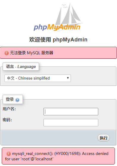 这时候在命令行已经可以登陆,但是在phpmyadmin中输入正确的账号密码却会有如下的错误: