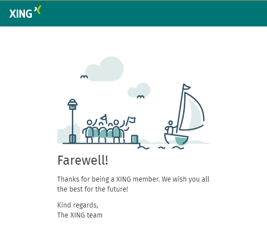邮箱收到的垃圾邮件百分之八十是XING发过来的,烦人至极,我也用不到这个网站,索性我就将我的账号直接删除了吧,过程还是很顺利地,让我填一些删除账户理由,把我搞这么烦我已经没有任何耐心添信息了,直接下一步点点点,当最后确认后一个返回页面触不及防地,特别地打动我。