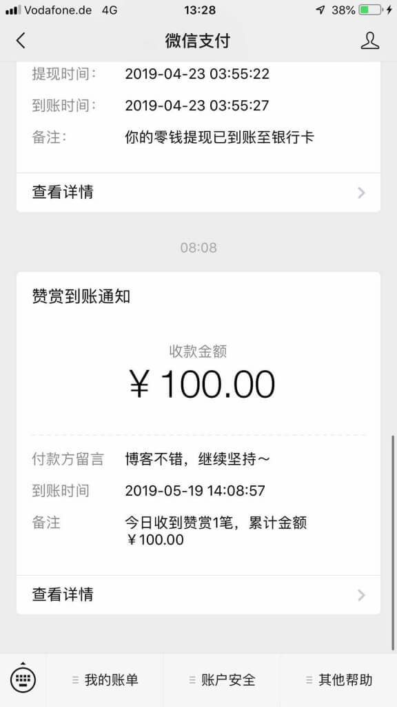 在我赞赏码放在这一年多,终于今天迎来也第一笔入账。早晨起来看到收款100元激动的快要跳起来了。但是可恨的是我不能知道是谁给我赞助了这么多,简直是一个惊喜。