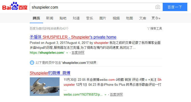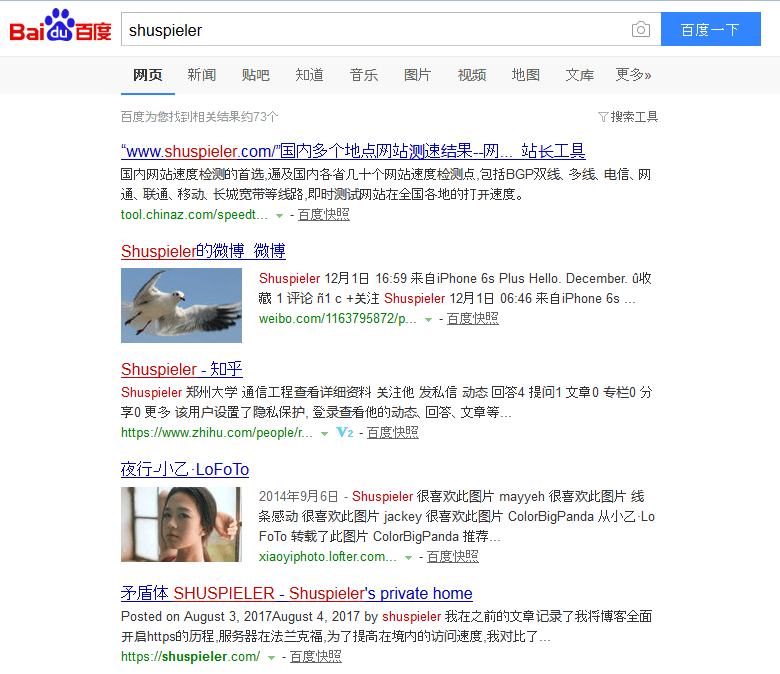 百度搜索我的昵称shuspieler已经可以看到我的主页了。可是现在权重还没有我的微薄知乎高。
