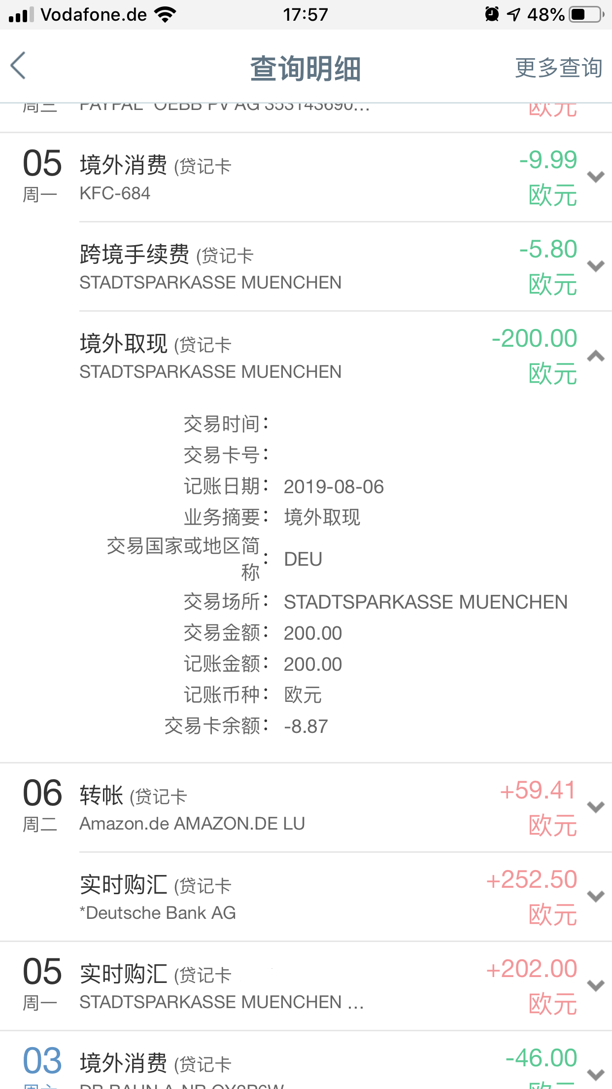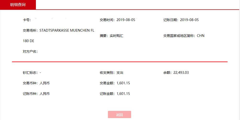 举一个例子如下图,我2019年8月5日在慕尼黑的一个银行取现200欧,网上银行(电脑版)提示只有一条交易,扣款人民币1061.15元。当时我天真的以为这是200欧对应的实时人民币,其实这应该是205.8对应的人民币。