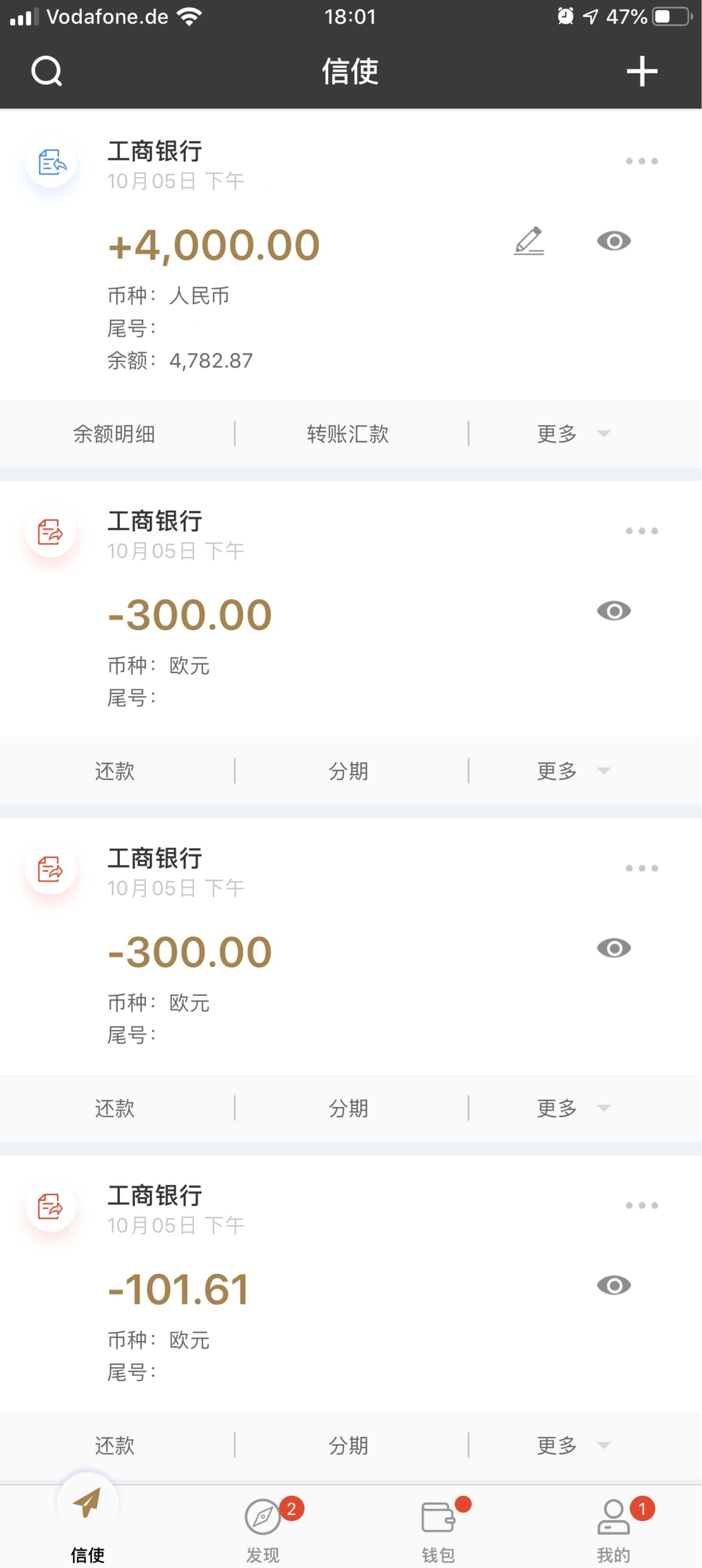 今天我偶然用手机银行查询详单,发现之前我取现的扣款情况不得了,每次在正常取现金额扣款外,还会有一个额外的5-8欧的兑换费扣款,而由于外币卡每次只能取200欧到300欧,所以我一年间取过很多次,所以把所有的兑换费加起来金额真的让人心痛。而关键是,这个扣款没有短信通知,同时在网页账单也不显示金额,网页端只给出一条人民币整体扣款的一项,让我误以为只是对应取现金额的等职人民币而没有其他费用,谁知这里边还有包含如此高的一个手续费。而只有手机银行的详情页才会显示出来是两条信息。真是坑啊。这才不如用银联借记卡取欧元呢,1000欧的手续费是大约11.5欧,而我用信用卡1000欧的手续费加起来高达29欧,心在滴血。同时经过我经过对很多银行卡的对比,以及付出超多真金白金的教训,现在中国银行卡境外取现虽然都很坑,都要收取高昂手续费,可是相比华夏还是很良心的。我对比过华夏的账单,除了扣除15人民币的款项外,没有任何这边货币的扣款,同时没有像工行这样默认很高的手续费但是不告诉你,只是偷偷的给你加到兑换后的账单上。因为汇率实时在变,所以特别不容易看出其中的问题来。在此建议朋友们能在国外不用国内的卡就不要用,能刷卡时候就不要取现金,迫不得已取现金能用借记卡就不要用信用卡,真的是钱的教训。