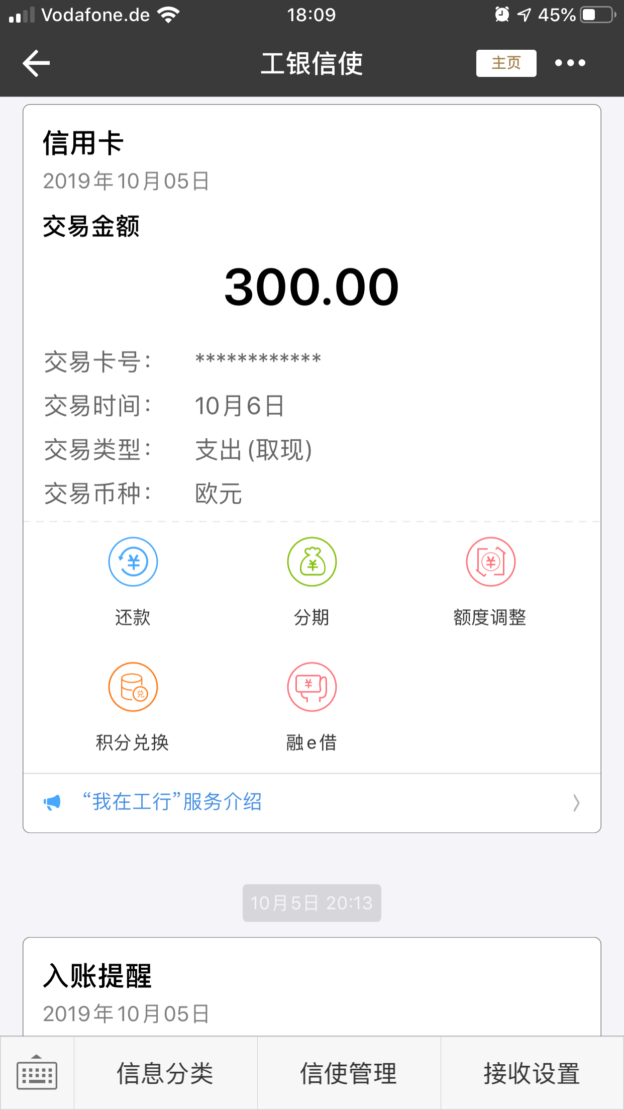 短信通知我这个对于的项目找不到了,我找了另外一个类似的,可以看到我连续取两笔300欧的现金,对于短信通知也只有这两个动态,并没有包含的服务费的动态。