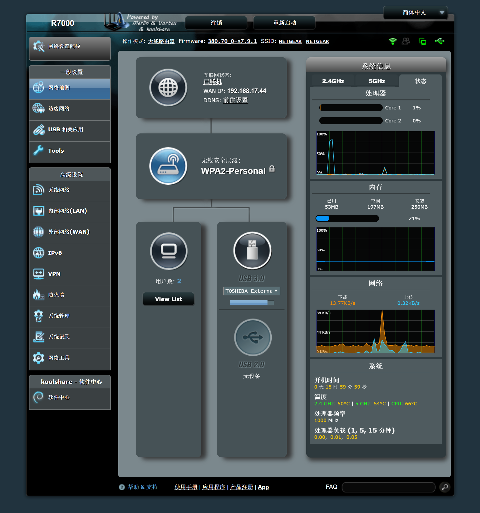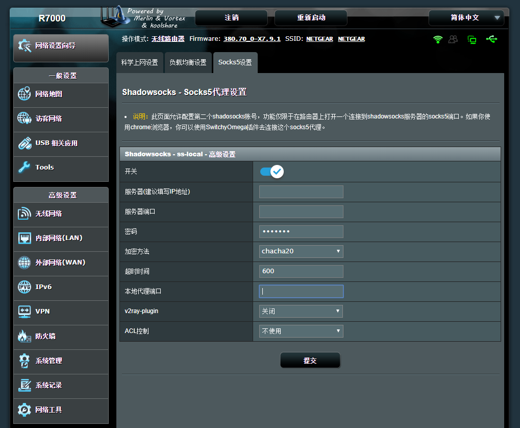 刷机步骤不记录了,我找了几个帖子跟着做很顺利。打开后台管理真的眼前一亮,面向消费用户制作的页面就是美观很多,比OpenWrt的Luci高几万倍吧。默认功能也很全了,并且我用的这个插件支持koolshare的软件中心。