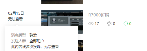 手机端显示的信息极为有限,点来点去我也没搞明白哪里违法。然后我打开微信公众平台网页版,里边信息稍微多一些,但是也是很杂乱。首先后台首页显示的原因是此内容被多次投诉,所以无法查看。我有点弄不明白一个技术贴为何还会别多次投诉,况且啊,我的这个帖子总共浏览了17次,其中一次是我自己,满打满算剩下的人全举报了,也就举报了16次。这举报封贴太严格了吧。