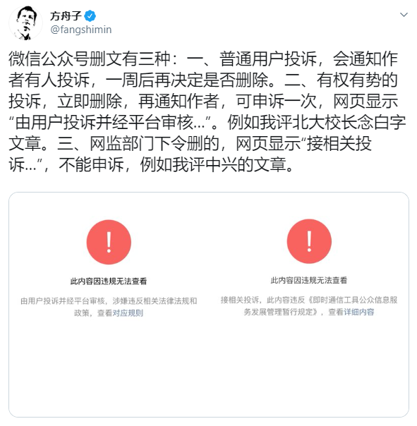 另外对于微信的说明文档模糊也很火大,让我这里找那里找申诉按钮,找了半天原来没有这个按钮,这也不提前讲清楚,害我浪费这么长时间,还得通过方舟子推文变相才支持微信的这种区别,这本应该是微信自己讲清楚的。另外腾讯对于删除理由也好不清楚,经平台审核,一会儿是经过多次举报,一会儿又是被计算机监察管理机构责令删除的,真是好混乱。另外监察机构的工作真的是好认真,我的这个文章是2月15发的,阅读只有17个,满篇技术,这么小众的一个帖子,一个多月后到了3月18竟然还有对这个文章的审查,也是厉害厉害。