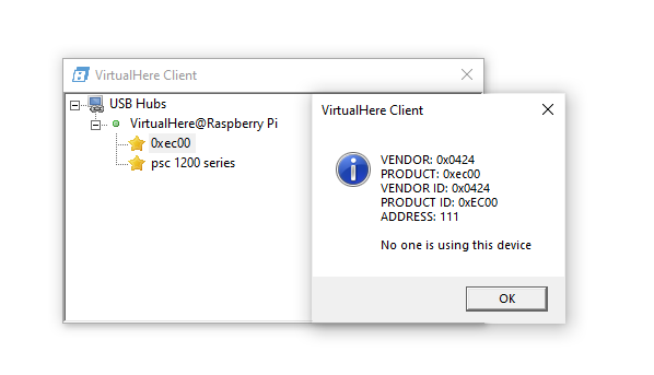其中IgnoreDevices的厂商和型号信息,可以通过Windows中VirtualHere 客户端右键对应的设备属性中查看。1435/0427是我的无线网卡的厂商以及型号信息,424/EC00是刚才提到的树莓派Ethernet的硬件。之所以这里我又写了出来,是因为经过测试,如果不加IgnoredDevices的话,这个设备被默认屏蔽,但是使用了这个命令,我只屏蔽了1435/0427的话,Ethernet的那个伪USB就显现出来了。我对此的理解是默认可以把这个端口屏蔽掉,但是如果我们选择手动屏蔽的话,那么这个文件也需要我们手动去打理。看下图设备信息,就是官方文档讲的那个USB to Ethernet 转换器。