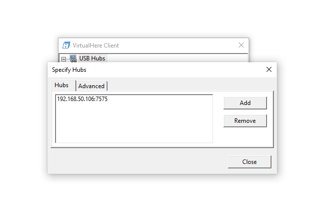 这样理论上讲,在和树莓派同一个路由器内网下的电脑,通过官网下载VirtualHere Client客户端就可以自动发现网络中的这个设备下挂载的所有USB设备了。在我这里Windows客户端自动发现功能并不好用,偶尔发现不到。所以我手动挡添加了树莓派的IP在VirtualHere Client里边如下图,前边的IP为树莓派内网IP,7575是免费版默认端口