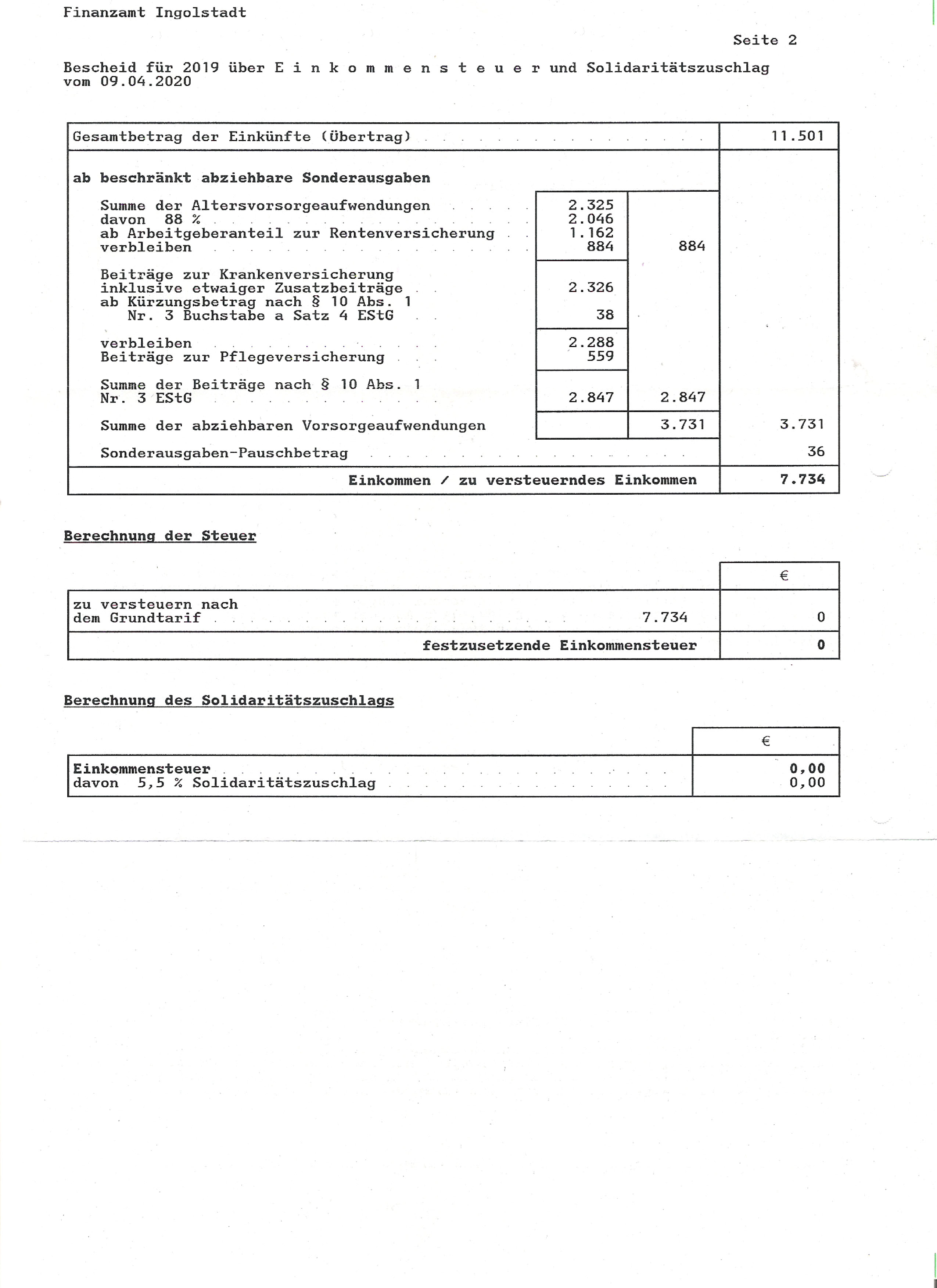 然后看我退税详情单可知道2019年毛收入是12501欧,然后减去找工作花销免税额度(找工作期间的交通费住宿费,买西服皮鞋的费用,还有买书本笔纸等,还有搬家费啥的,以及为了找工作参加的培训,都是可以算到免税额度中,这部分找工作费用有德国政府承担),我当时还填了去公司交通费用等等等等,在德国退税是个学问,不过我没那么多项也无所谓了,他们给凑了个整数1000欧。然后详情单第二页写着养老保险百分之八十八免税,护理保险免税,医疗保险免税。也就是说,在上述6项扣除款项中,百分之12的养老保险还有失业保险不算在免税额度中,其他的都是免税。