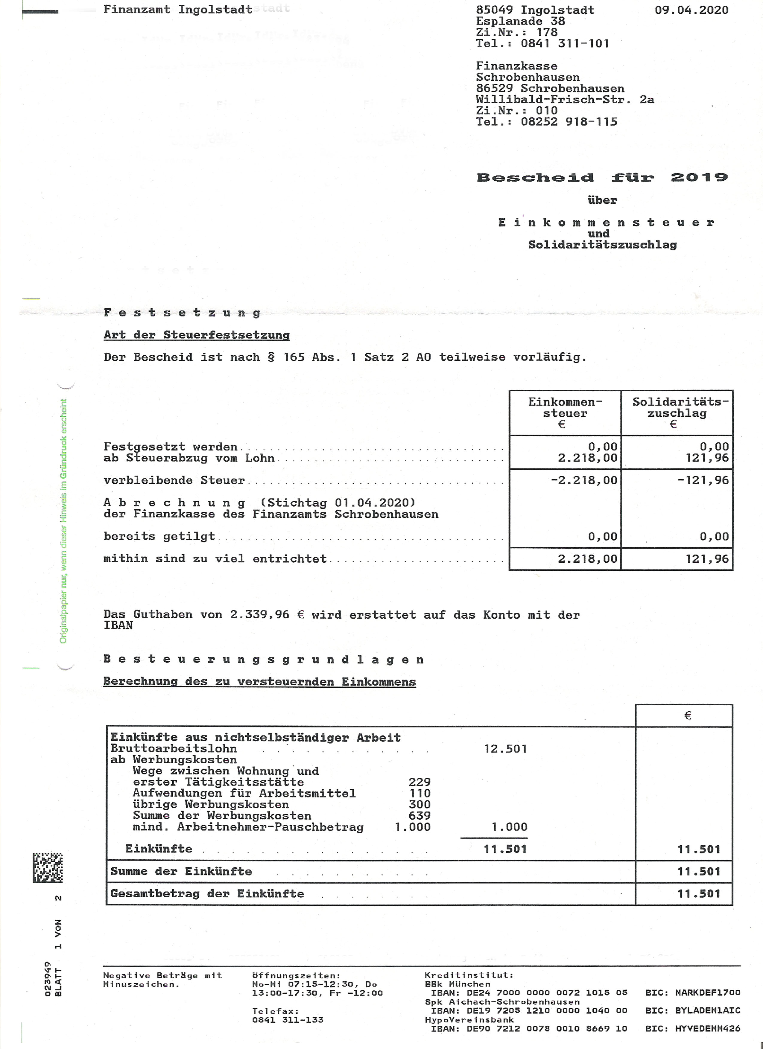 这样通过毛收入12501减去找工作凑个整1000欧免税额度,上边各种保险免税额度3731欧,以及特殊免税36欧,余下7734欧是我的收入需要征税的地方,而2019年个人所得税起征额度是9168元,所以我没有达到起征点属于低收入人群,需要交的个人所得税为0。这样去年我相当于由于自动每个月扣除年度结算多交了2218欧的个人所得税和121.96欧的支援东部建设税,然后通过年底报税进行多退少补,我就在昨天收到了退税2339.96欧。