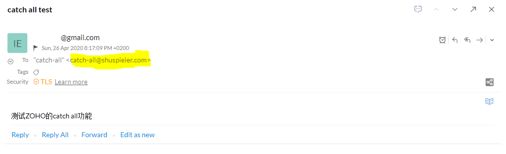 下图是用我的谷歌邮箱,给我位于ZOHO免费邮箱管理员账户发的邮件,当然这个必须收到了,没有任何疑问。