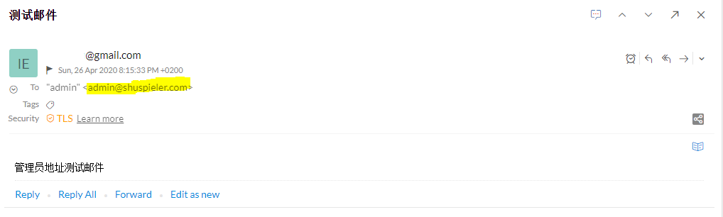第二个是用我谷歌邮箱给一个我在域名邮箱中不存在,没有生成账户的一个地址发一份邮件:,同样在我的管理员邮箱中可以收到。并且同时可以看到收件地址是从从catch-all来的: