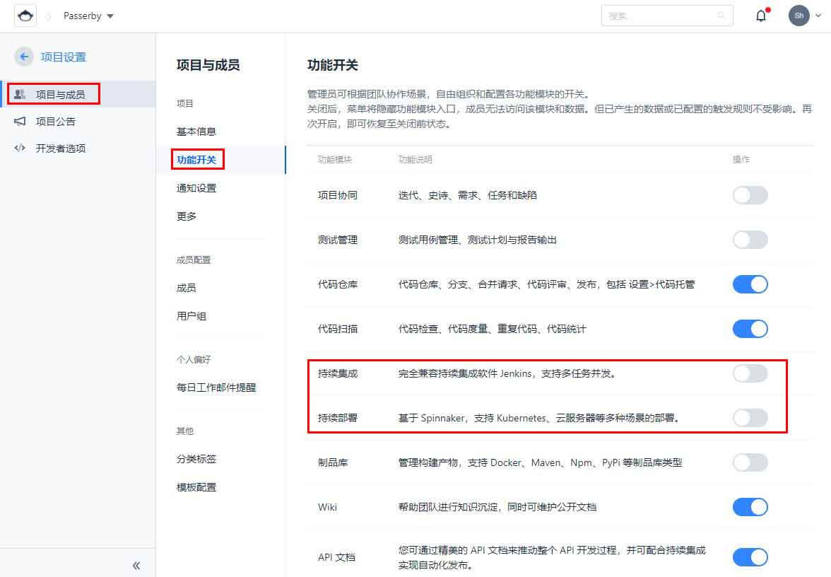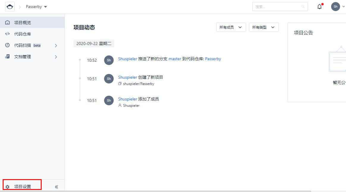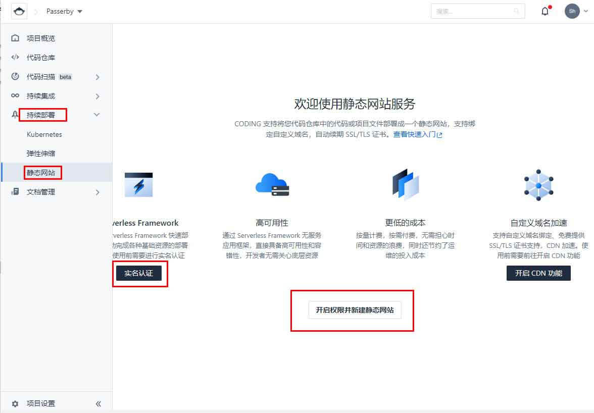 - 于是到了这一层才与官方文档相似,由于静态部署功能默认是关闭的,所以在这里需要手动打开,点击项目设置。