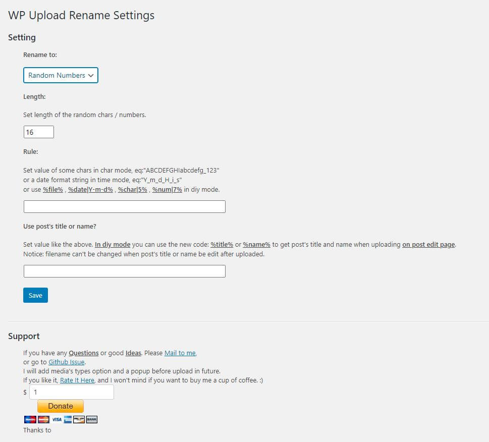 - wp_upload_rename, 图片上传自动重命名应该是很多同学的痛点,我尝试了好多好多插件,还包括在主题function中使用脚本。都有何种各种各样的不满意。很多其他插件要不收费,要不就不能满足我的重命名要求,而使用function脚本,主题文件又不能轻易升级,因为会造成function中自己添加的脚本丢失的可能性以及兼容性。而这个插件简单明了没有花里胡哨的功能,还是免费,并且可以自定义重命名后的格式,简直是喜欢的不得了。也因为功能简单,源码在Github也是开元,所以减低了插件带来漏洞的风险,有一定PHP基础的小伙伴甚至可以自己改良插件,因为真的没几句代码很简单。这个也是我第一个主动想并且去实施给作者赞助的插件。对于文件重命名有需求的同学,真的强烈推荐。