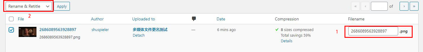 - Phoenix Media Rename 这个是我今天用到的插件,主要用于手动更改一个图片的名称,以及像我一样,在安装上个插件前以及上传过很多图片,对于这些历史问题,就可以用这个插件再手动处理一遍。这个插件也是没有什么花里胡哨的功能,安装后在媒体库会多几个按钮,用法如同我下边截图,在1号框给入新的名称,在2里边选择更改文件名,以及文件在Wordpress里边的标题名,我一边都改。然后Apply一下,插件就将储存在服务器上照片的名字,以及博文引用到照片地方的地址,都自动更新了,特别棒。