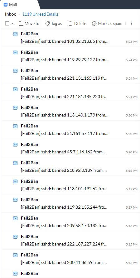 服务器的SSH服务由于远程配置的原因,需要暴露在公网。虽然使用了一系列安全措施比如关闭root登录,普通权限与超级管理员权限分离,更改端口以及使用第三方工具比如强力爆破,可是看sshd的log每天依旧有数不清的登陆尝试,Fail2Ban也在孜孜不倦地一直将这些IP拉黑。昨天看到Fail2Ban可以开通邮件提醒功能,于是配置了一下,没想到邮件雪花片就飞了过来,基本上每分钟都有被ban掉的IP,一晚上竟然收到了一千多封邮件,并且早晨早早的,由于手机勿扰模式天亮就自动关闭了,邮件提示音把我吵死了。
