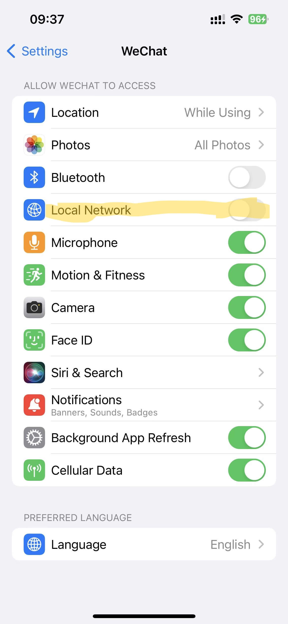 然后关键的一步,就是在iPhone手机设置里边,微信设置,开启允许本地网络,如下图高亮。