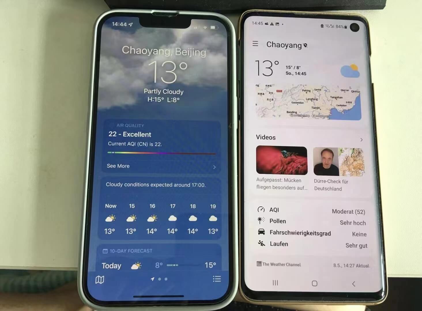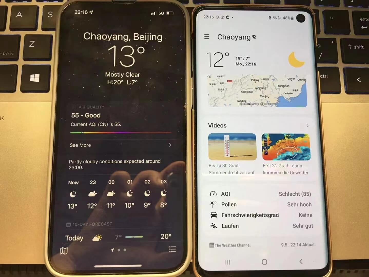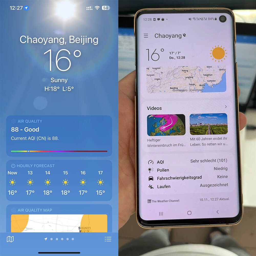 三四月份刚回来时候也有一定程度鼻炎过敏,那时候我猜可能是花粉,之前没过敏过,体验下来也是挺难受的,从那时起养成了看空气质量的一个习惯。我发现同一个地儿的空气质量与所用的手机有关系,以及是用百度或者谷歌查询有关系。比如下边的几个例子,两个是春天同一天拍的,中午用苹果查出来AQI是22评级是非常好(Excellent)而右边三星同一时间查出来的是AQI是52评级是中等(Moderat)。另一张晚上用苹果查出来的是55评级是很好(Good),右边三星查出来是85评级很差。这几天由于我鼻子很难受,我又对比了一下,中午时间苹果AQI是88评级是很好(Good),三星AQI是101评级是非常差(sehr schlecht)。真的很有意思,同一时间同一地点的空气质量,竟然与用户使用的手机品牌有关系,也是长知识了。