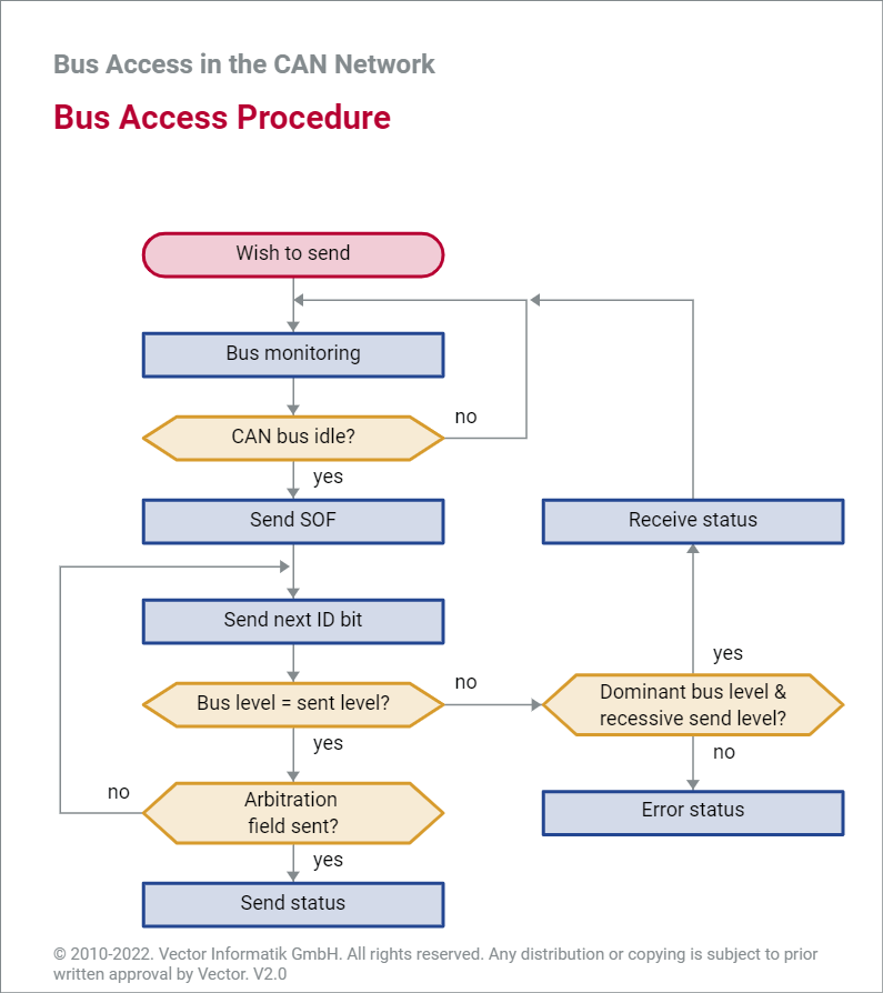 总线由于同时供多个节点使用,减少线束的同时,会有多个节点同时发送造成冲突的风险。各个检点都在检测总线是否空闲,当总线空闲再开始传送,当最坏情况恰好两个节点都准备开始传输,从SOF开始发送数据,由于从最有效位到最低有效位传送,这个时候就会根据ID的优先级决定谁使用总线。ID数字越小,也就是显性会覆盖隐性,从而可以或者仲裁胜利,无损总线数据继续发送。当优先级低也就是ID大的节点检测到总线上数据与自己发送的不同(被其他高优先级的节点显性电位覆盖),即知道同时有高优先级节点在发,即会立即停止发送。
