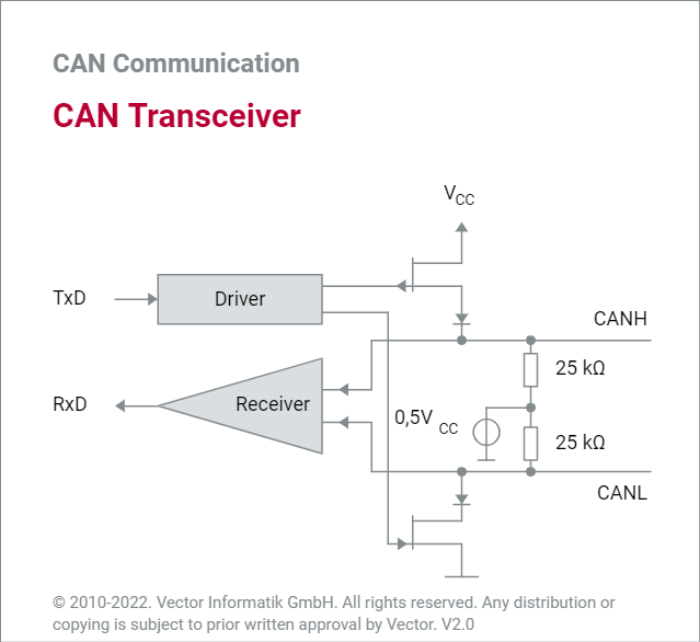 同时显性会覆盖隐性,也就是说,当同一时刻不同的节点有发送显性也有发送隐性,那么在总线上会展示成为显性,只有当所有的节点都发送隐性的时候,总线才会展示成隐性。我是这样记忆的,假设我们有多个TxD,只有所有的Driver都发送逻辑1:隐性,也就是所有上边和下边的三极管都是断开状态(Driver输出0),那么对于Receiver才能测出差分电压为0,单反有一个TxD发送了逻辑0,就是有一对上下三极管是接通状态(Driver输出1),那么CANH和CANL就分别接到了VCC和GND,那么Receiver检测的差分电压就是2V。当然现实情况会有一定的误差,CAN协议规定当差分电压大于0.9伏才能被认为是显性(逻辑1),差分电压小于0.5V才能被认为是隐形(逻辑0)。
