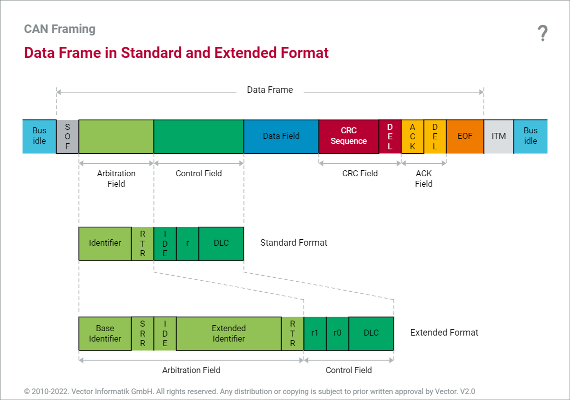 在SOF后试一个帧的ID,这个一方面是代表了数据帧的优先级,另一方面是在接收端用于区分是否是自己需要的数据。在标准格式中,ID后的RTR(Remote Transmission Request)是总线层面实现的请求一个节点数据的。一个显性的电压代表这是一个普通的传输数据帧,反过来如果是隐性的电平,那么就是一个请求数据帧。这个数据请求帧没有Data Field,其他的与数据帧组成相同。在汽车领域这个功能一般很少被用到。