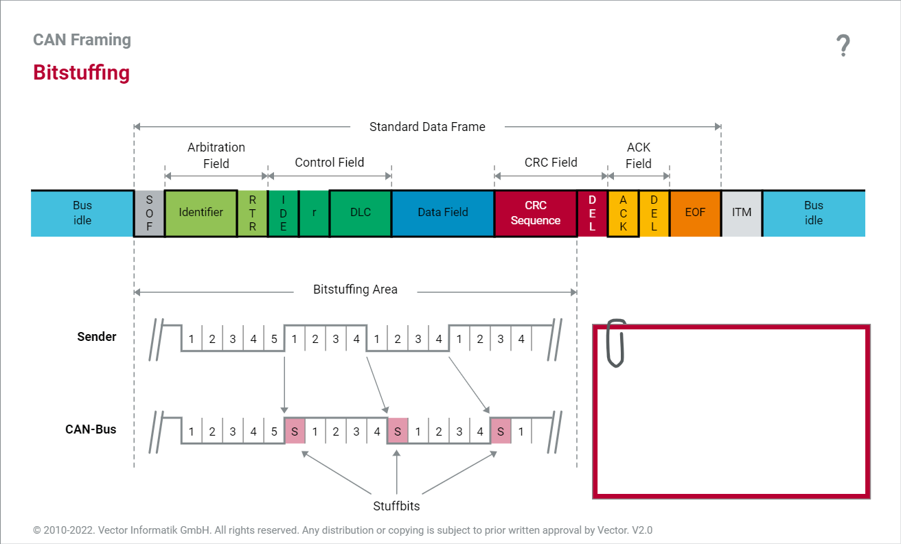 在串行数据传输的过程中,所有节点保持时间同步是一个非常重要的前提。通常情况下各个节点通过SOF显性到隐性的转变,来进行初始同步,之后通过传输数据流中的隐性到显性的转变进行同步修正。这就有一个问题,当数据流长时间保持显性或者隐性很长时间的话,那么一些节点可能由于自身时钟的不准确,造成失步。于是根据 ISO 11898-1 标准,在CAN总线物理信号中, 当都一个点位持续够5个时钟单元,那么在总线信号中就会插入一个补偿Bit位,与之前连续5个电位保持不同。这个被插入的补偿位也会被计算到下一个连续5个同样点位从而判断是否需要补偿电位的检测中。这个补偿位从SOF到CRC最后一位都需要考虑,如果数据为按照最长8bytes算的话,那么极限情况会有24个补偿位,所以理论上,一个标准帧最长位132Bits。