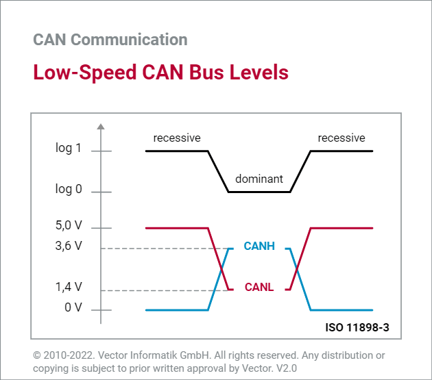 CAN标准可以再细分为高速和低速两种不同的子协议,主要区别在于物理层的电压不同从而最大传输速率有区别,低速CAN(CAN Low Speed)遵循 ISO 11891-3 标准,最高传输速率为 125 kbit/s. 高速CAN(CAN High Speed)遵循 ISO 11898-2 标准,最高传输速率为 1Mbit/s。通常我们汽车领域用高速CAN并且设置速率为 500 kbit/s,同时低速CAN也有特有的优势,比如说抗干扰能力强。