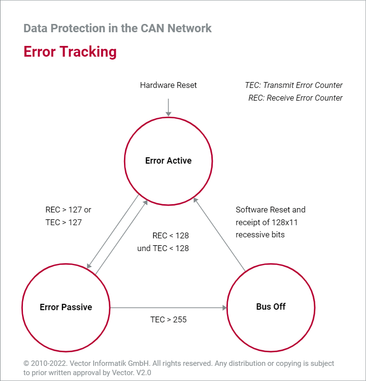 之所以记录这两个数值,是为了降低个别失效节点对整个总线的损害。每个节点根据REC和TEC的值有Active和Passive以及Off三个状态,Active指的是发现错误可以发送显性错误帧,而Passive是发现错误只能发送隐式错误帧,Off是节点关闭状态,与总线断开。根据REC和TEC的值,节点在这三种状态的切换要求如下图: