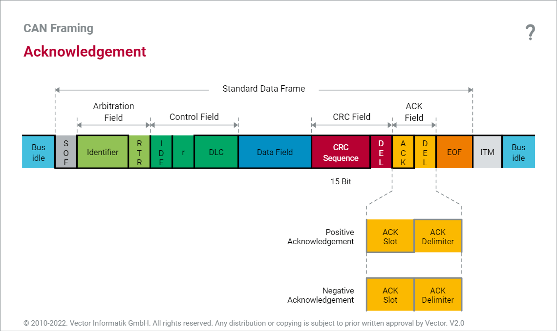 ACK(Acknowledgement)这一个位,所有的接收端都会发送,并不管这个数据帧ID是否是给自己的,发送端会监控这一位,从而得知是否至少一个节点正确接收到了这个信息。显性的ACK代表正确接收,隐性的代表没有正确接收。之后的delimiter是一致显性,这样下面两种组合代表了ACK的显性或者隐性。