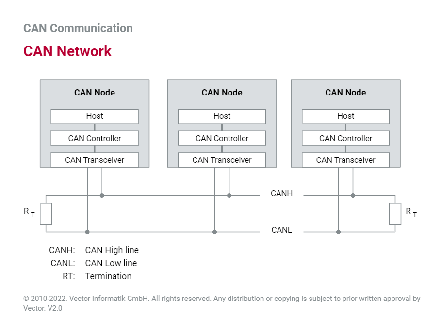 通常情况下,CAN协议通过硬件控制器(CAN controller)的形式实现,物理信号的收发通过CAN收发器(CAN Transceiver)进行。通常选择非屏蔽双绞线来连接CAN收发器,传输距离不超过40米,并且在两端需要连接两个120 欧姆的电阻(仅高速CAN,低速CAN不做要求),以防止信号反射造成干扰。协议还规定了,一条CAN总线最多连接32个节点。
