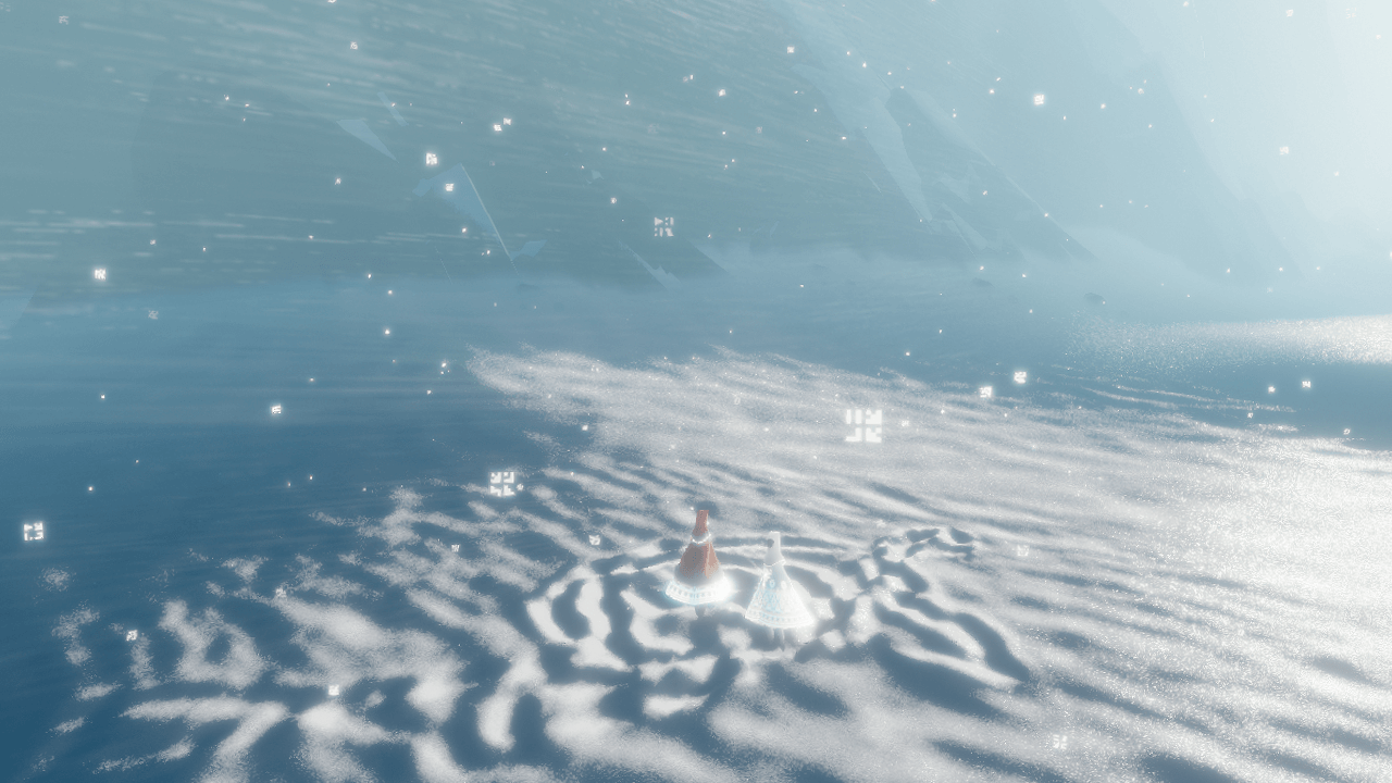 很长一段时间都是一个人孤独的旅行着。在某个瞬间,会出现另外一个和自己穿着一样的伙伴出现在地图中。两人甚至不能交谈,唯一沟通的方式就是发出类似于唱歌的音符,长短自己可以调控。经常一个伙伴都会欢喜地轻快歌唱,并且围着Ta转圈圈。这是这个世界唯二的两个人了!整个旅途就只有这两人相依为伴,在靠近的时候身体会感受到温暖,发出暖人的光芒,尤其在雪地里,自己一个人时候孤独到绝望,身上是厚厚的积雪,眼前却是永远看不到边的雪山,而当两人一起的时候,相互依偎会彼此融化对方的积雪,心也开始发光,怎能不令人感动。