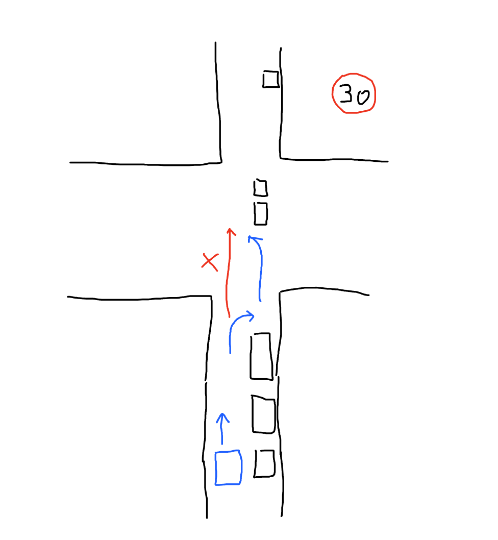 9. 小道有时候自己的的方向的车堵上了,街道到下一个路有左转的话,如果有足够的位置,需要回到自己的车道。因为假设此时有一个右边来车左转,因为我借道堵上了右边的那个车,影响了交通,必挂