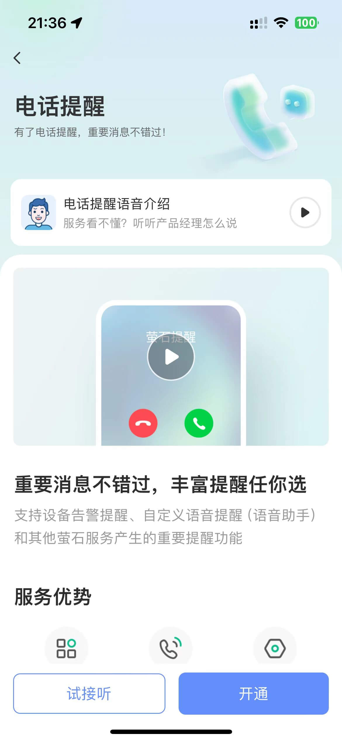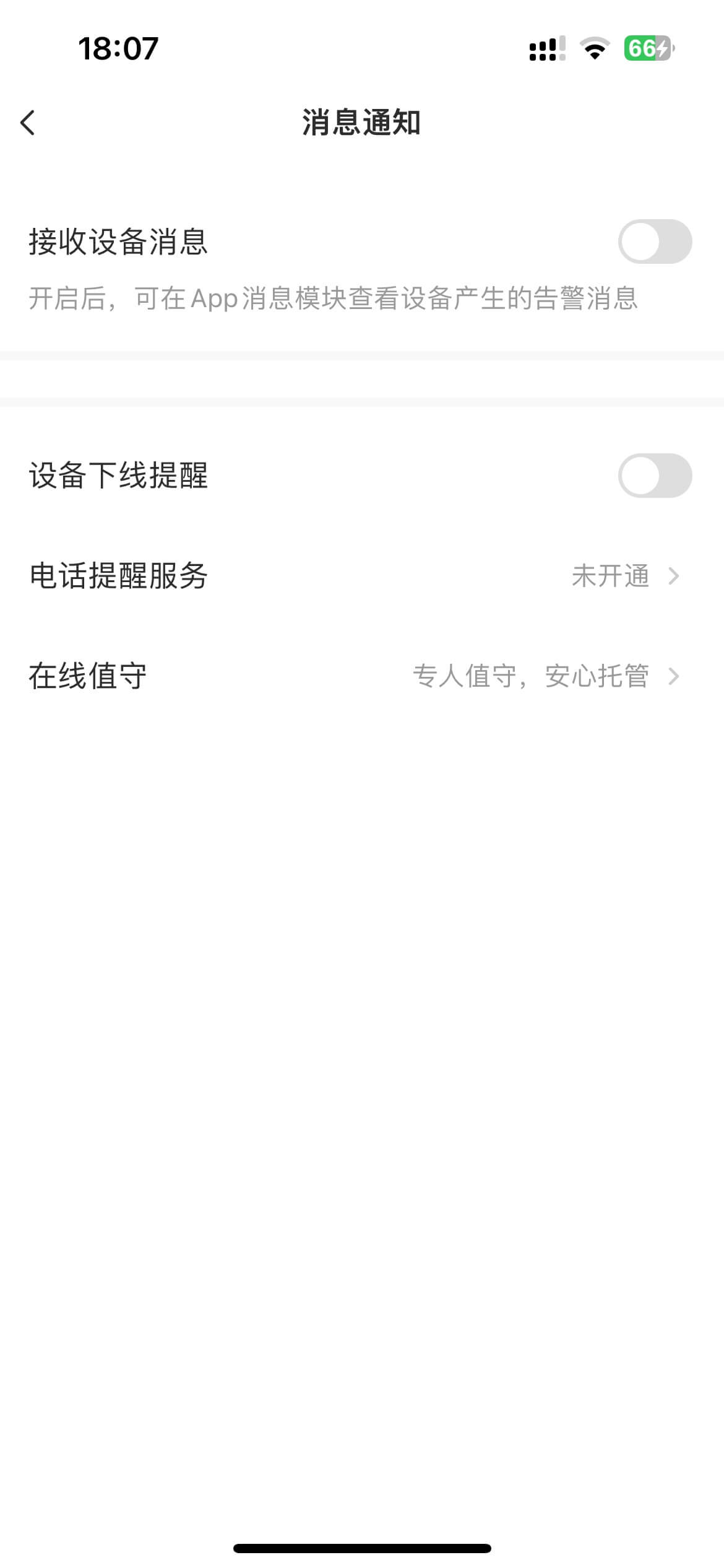 下边说一下另一个品牌:萤石。之所以没有选择这个,是因为这个品牌不支持SMB或者FTP这两个常见较容易搭建的网络存储空间。若想搭建自己私有云远程备份,就需要用到萤石官方的电脑上位机软件,或者在NAS中运行Surveillance Station通过萤石支持的RSTP协议进行管理。这样子一下子成本就高了起来,要不就用一台24小时开机的电脑,要不就是买一个NAS。虽然我自己有NAS,但是我不愿意长期运行一个软件,这对我NAS的寿命也有影响,萤石的解决方案远不如SMB/FTP轻巧方便。但是萤石有几个功能非常实用,而这部分小米是做不到的,就像下图的“设备下线提醒”,“电话提醒服务”,“在线值守”如下图。对于家庭来说,设备下线提醒很有必要的,有时候设备由于一些原因已经离线很久了,但是用户并没有及时察觉。另外两项对于商家感觉很有必要,当出现异常情况,APP通知可能不能及时看到,但是打来一个电话这优先级还是很高的,将异常及时送达的效果也高很多。在线值守的话,更像是用AI的能力在检测一切可能出现的异常。总之感觉下来,可能也与萤石是海康产品的原因,很多的功能有很重的商用设备的味道,就比如远程管理的模式和这几个额外服务,像是一个商用摄像头的简化版拿过来民用。总之是各有各的好处和特点,如果他们俩能够相互学习借鉴一下,那就更好了。
