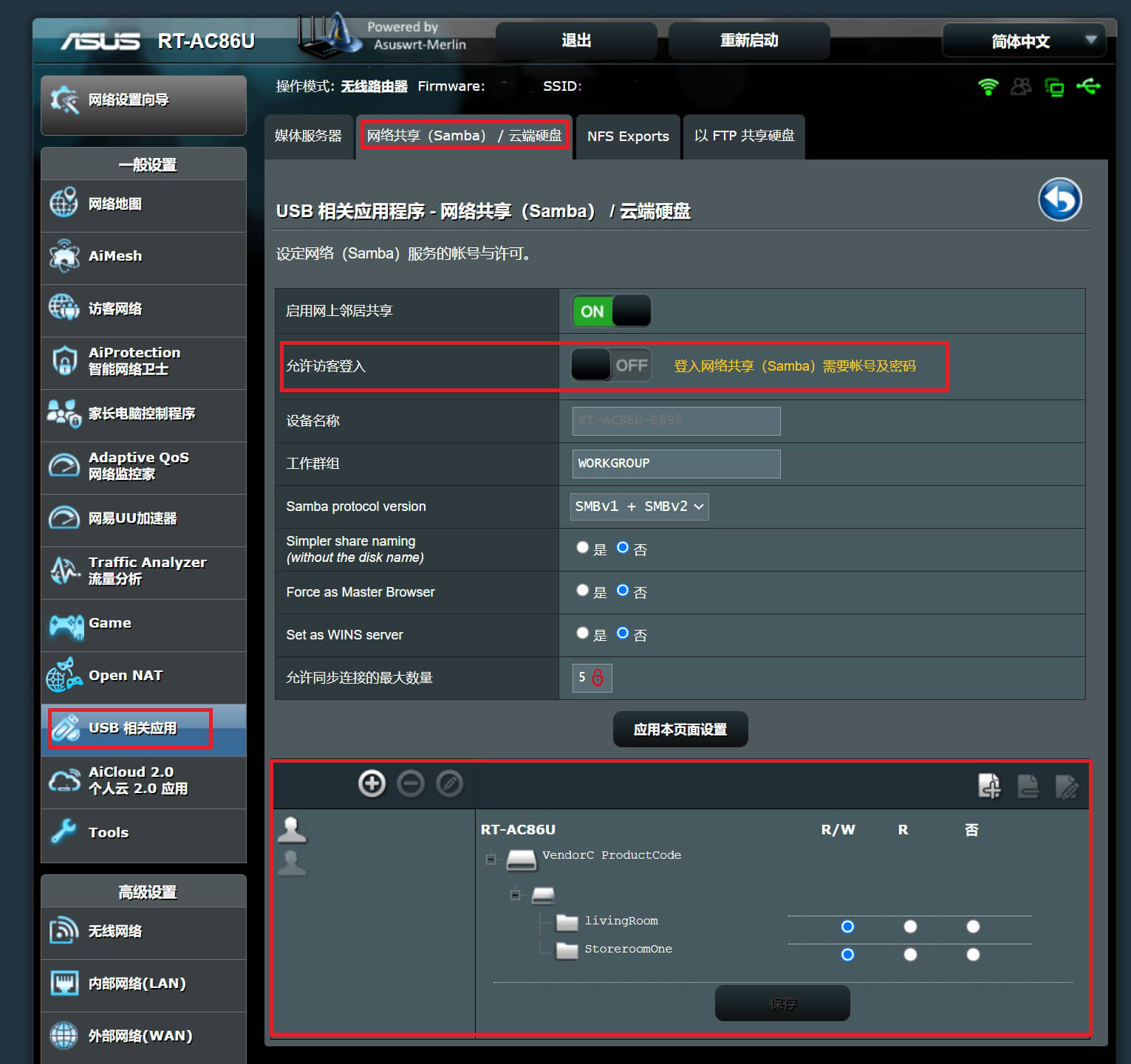 我所用的华硕路由器还可以执行健康度检查,隔一段时间可以运行一下,看看这个U盘有没有出现什么问题。当设置好后,点击左边“USB相关应用”,二级菜单选择“服务器中心”,三级打开“网络共享(Samba)/云端硬盘”,在这里就可以设置Samba共享网盘的信息了。在这里建议将允许访客登入关掉,以防止知道你家Wifi后直接就可以看到网上邻居共享文件家中存放的监控视频。在下方红框内可以设置共享网盘的用户名密码,以及开放的文件夹权限了。建议新建一个文件夹而不是存在U盘根目录,然后将权限设置成读写(R/W)。