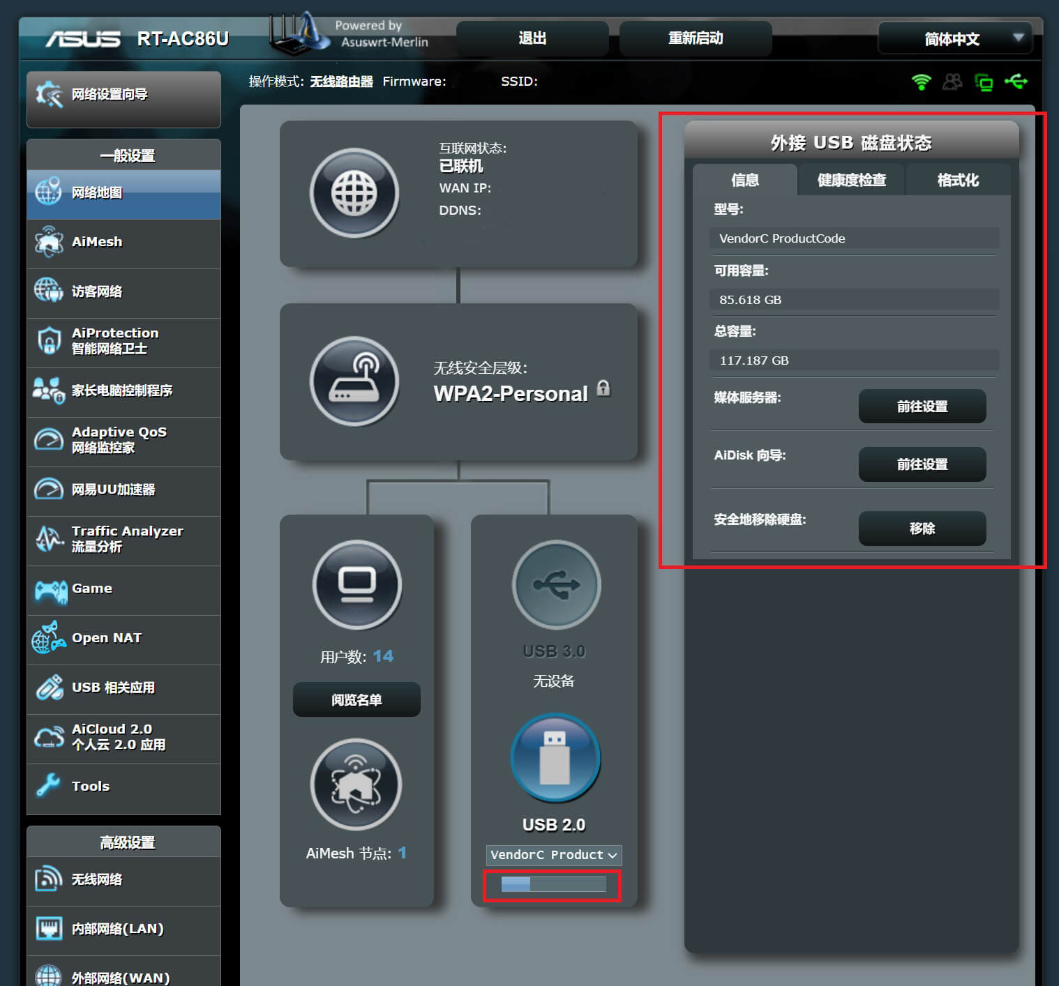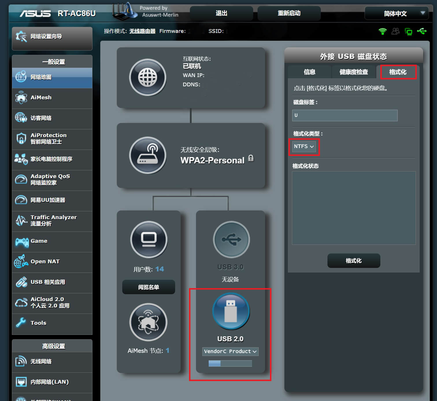 在路由器设置页面,已经可以看到USB2.0高亮代表识别到挂载了一个设备,点击然后格式化一下,建议使用NTFS格式,带日志,对于文档安全性好一些。在右侧信息一栏可以看到容量用掉了多是还剩多少,在中间那个长条也是显示已用容量,如下图。