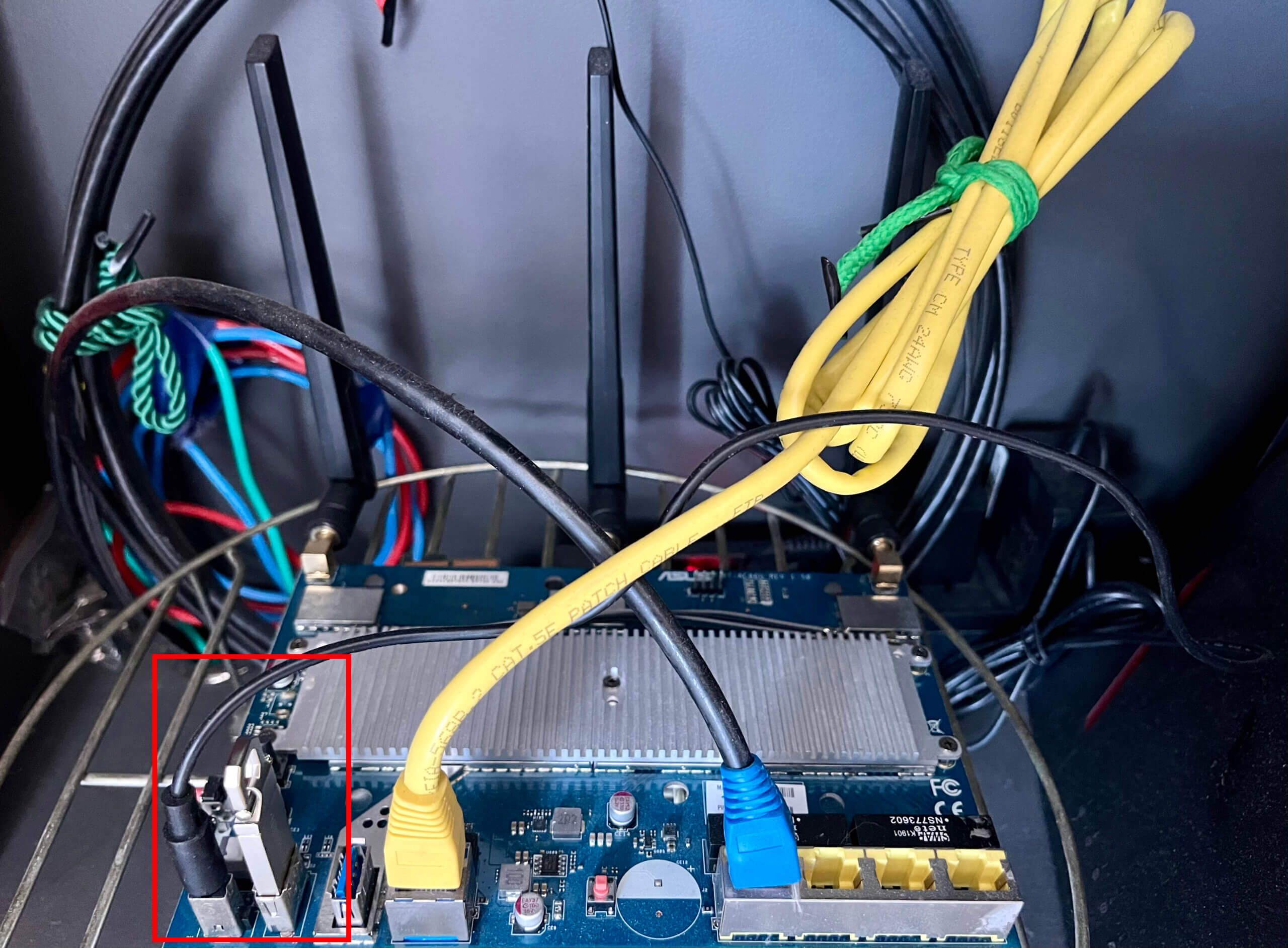 经过查询以及亲自体验知道小米摄像头支持Samba协议将视频转存到局域网中的NAS服务器里,而NAS只是个代称,只要是Wifi同一个网络中支持Samba储存协议的设备都可以,最直接的就是路由器本身了。现在绝大多数的家用路由器都有USB接口,支持Samba协议将U盘设置成共享网盘。我的路由器AC86U其中的一款,在硬件设备上,把U盘插到这里,如下图。