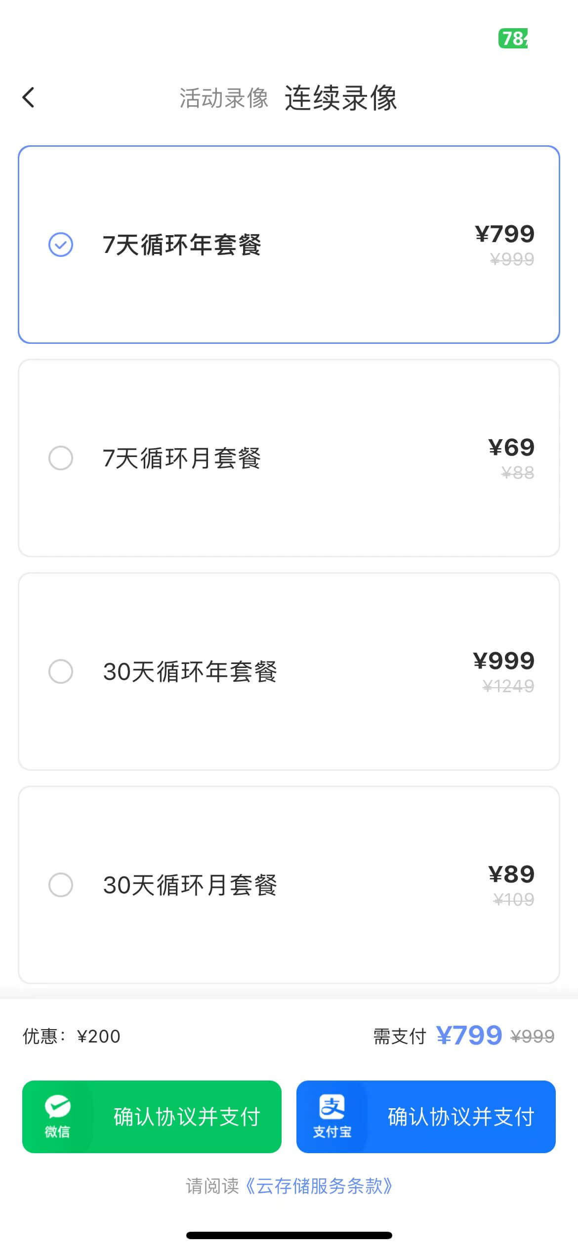 两个品牌云存储费用有一些区别,小米7天滚动存储是188一年,萤石是对于活动录像139(160原价)一年,可以理解成只存储带事件的那一段,如果是全部存储价格高达了799(原价999)元。