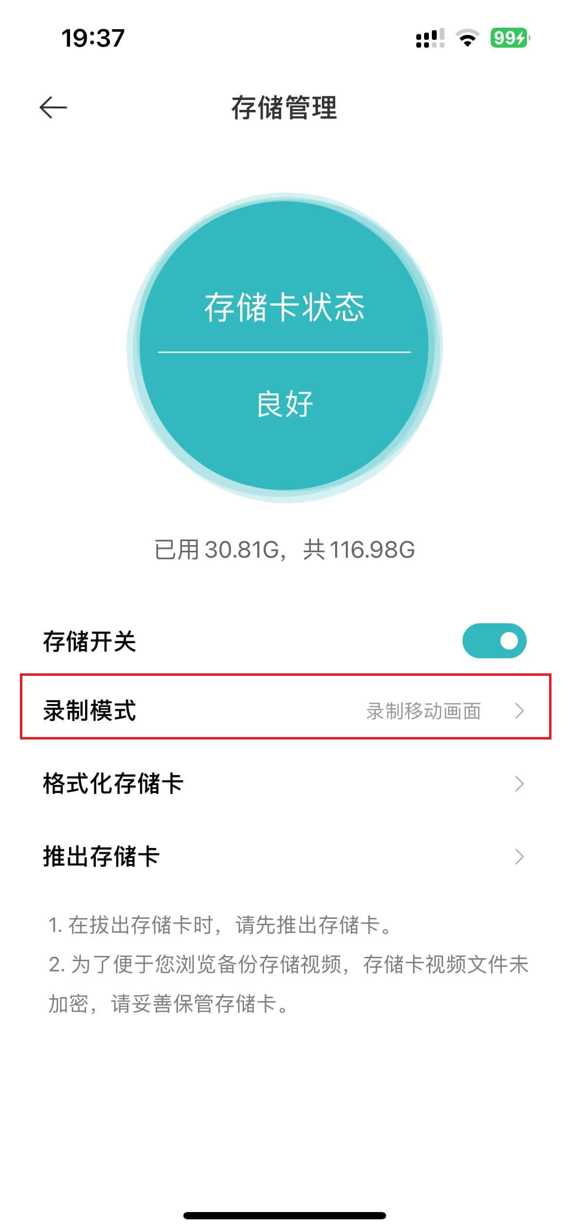 到目前为止基本上我们的私有云滚动存储就设置完了,在这里有两个可以优化的点,可以进一步加强储存设备的稳定性,首先是若无特别需求的话,在存储卡设置中将录制模式设定成录制移动画面,这样可以大幅降低SD卡可U盘的负担。另外如果条件允许的话,强烈建议将U盘换成移动硬盘,或者SSD U盘,提高硬件的可靠性。