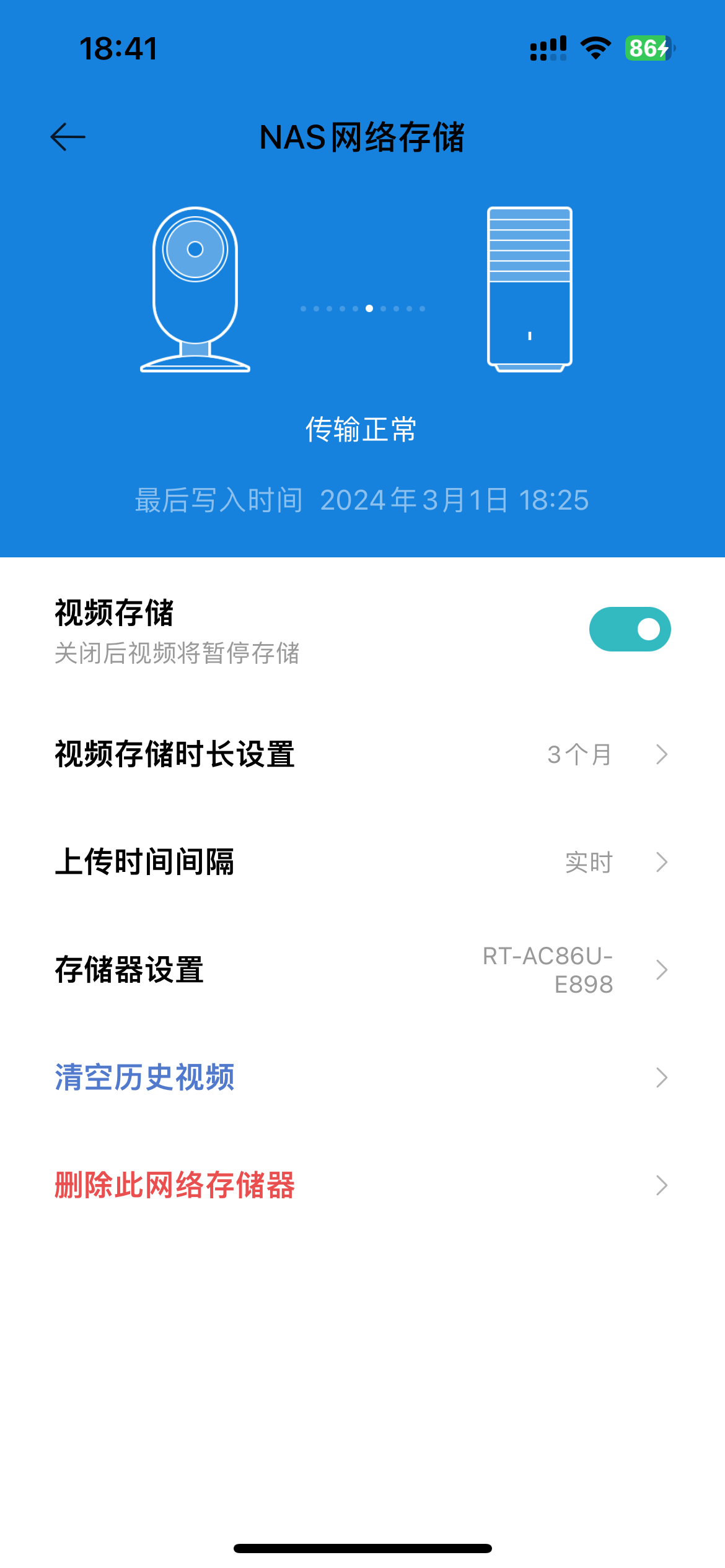 当我们设置好后,在米家应用小米摄像头设置页面,我们已经能够看到存储设置下,NAS已经不在是灰色,变成了黑色可用状态了,点击进入输入一些基本用户名密码信息,然后选择要存到的对应文件夹,这里可以看到识别到的文件夹名字,就是我们在路由器中设置的名字。一切设置好后就可以看到小米摄像头可以正常转存视频到路由器下的U盘了,这里还有一些设置比如说视频储存时常设置,这个可以理解成滚动存储,根据自己U盘大小按需设置。上传时间间隔建议选择实时,这样才能达到我们的目的,及时转存摄像头拍下的数据到云端。
