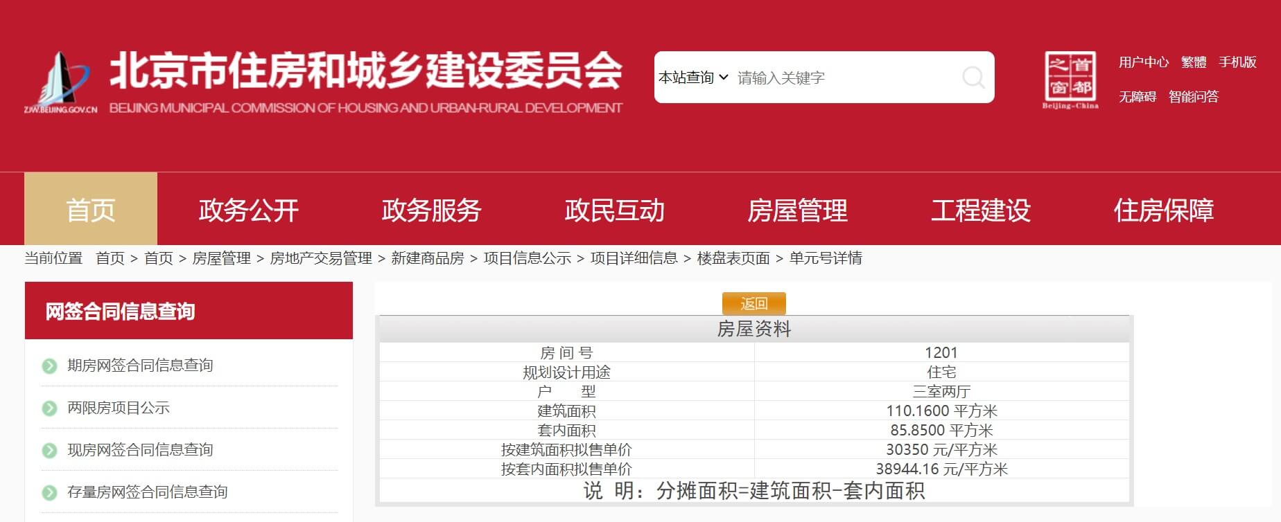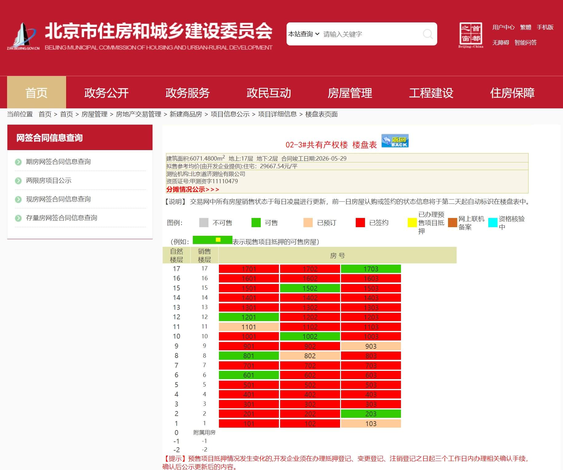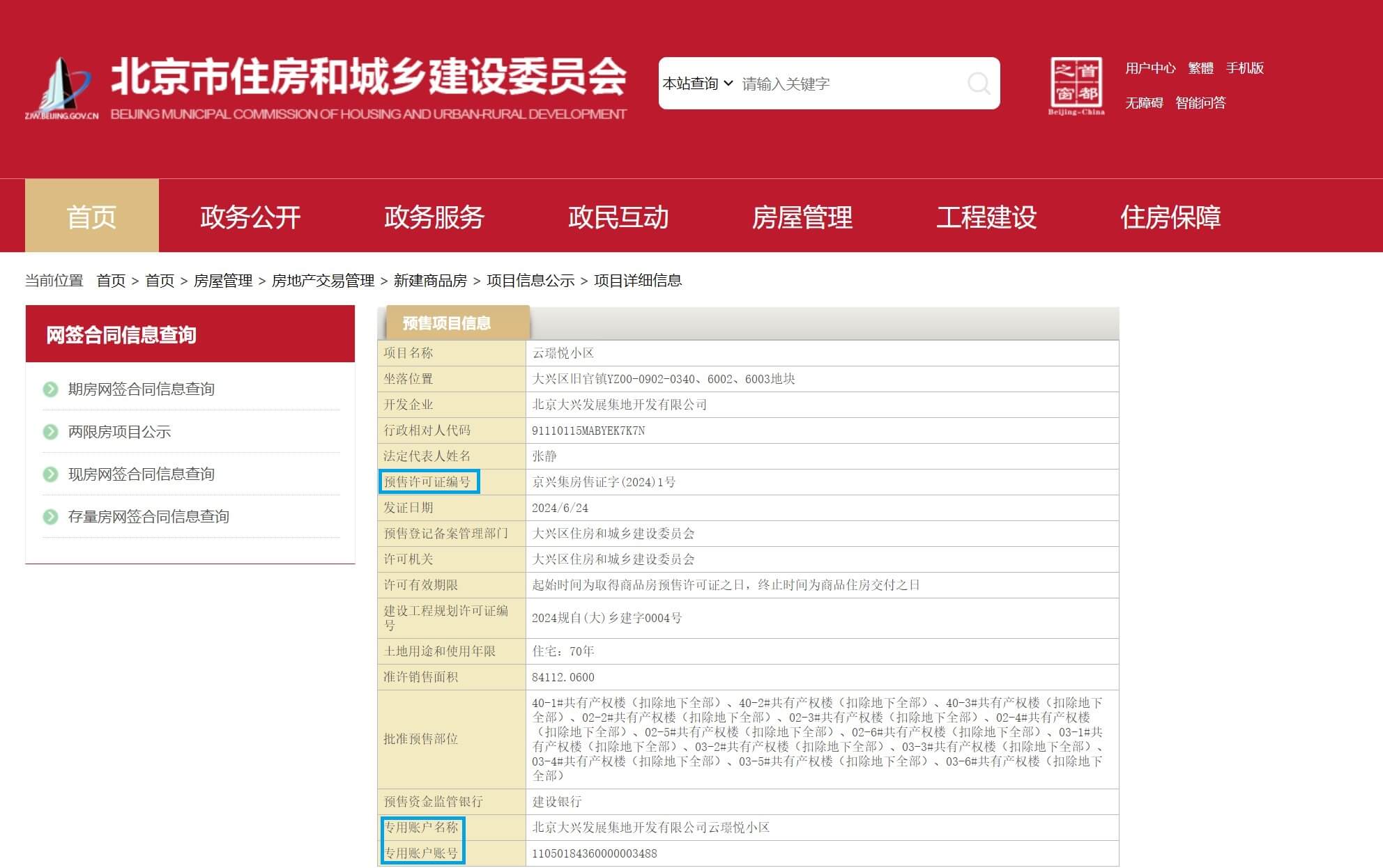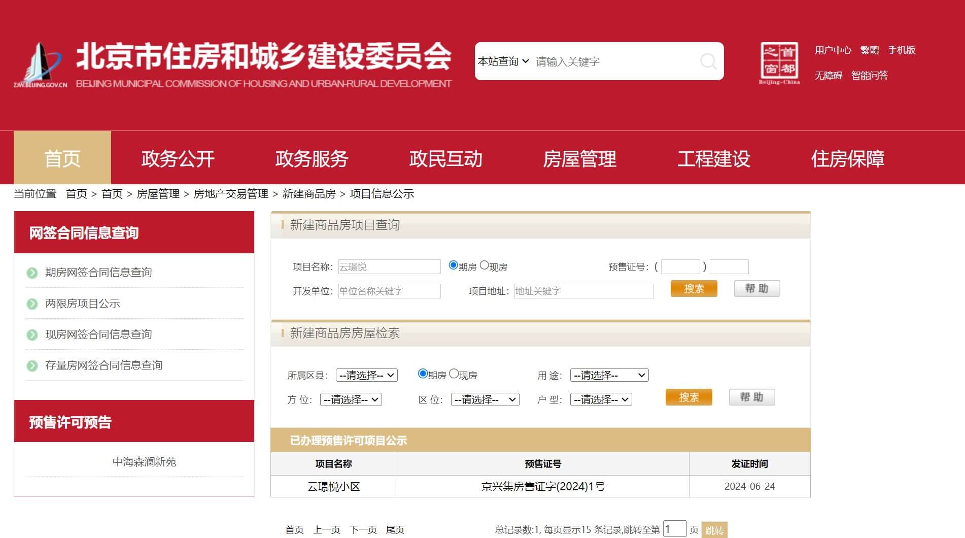 多数开发商在售楼部会将这些信息公示出来,若买家逐一检查核实这五证其实是有难度的,比较现实的做法是检查最后一个《商品房预售许可证》,当开发商有了这一个说明已经办理过前边的手续并且已经过了层层关卡了。我们检查这个也比较简单,登录北京市住房和城乡建设委员会(https://zjw.beijing.gov.cn/),在下方查询中心找到:新建商品房项目查询。在弹出页面输入项目名称,也就是小区名称,如果这里能查到信息那么基本上问题就不大了,我们点击小区名可以看到具体的信息: