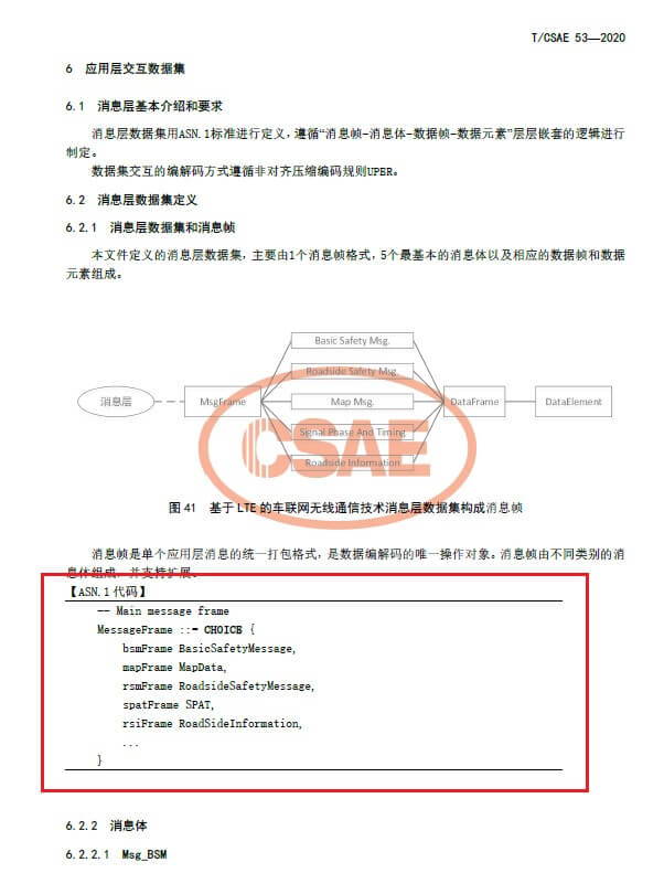 消息层的标准主要目的是规范各家厂商在对于上一章节网络层中Payload(数据Data)的编码方式和编码内容,所有参与者使用同一规则编解码具体数据才能实现互联互通。其中在编码标准上,消息层数据集用ASN.1标准进行定义,遵循“消息帧-消息体-数据帧-数据元素”层层嵌套的逻辑进行指定。数据集交互的编解码方式遵循非对齐压缩码规则UPER。通常来讲各厂家使用同样内容的.asn文本文件,其定义了下文消息类型,然后使用成熟的ASN编解码库,就可以实现各自软件应用中数据的互联互通。