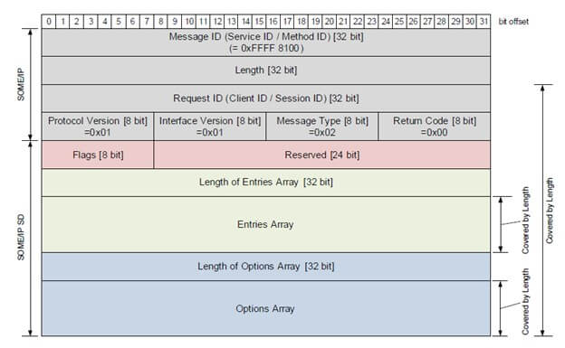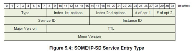 根据标准要求,SD的头部的Service-ID和Method-ID是固定的,分别是0xFFFF和0x8100。至于是Offer Service还是Find Service,以及在实际中经常用到的Service服务版本,在标准中是在Entry内容体现的: