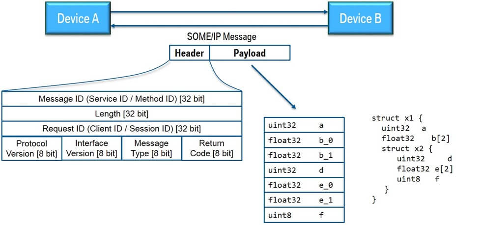 首先SOME/IP的数据包分为Header和Payload两部分,而这两部分当作一个整体,作为TCP/UDP的Payload通过IP进行传输。如图所示,两个设备(A和B)之间通过SOME/IP协议进行通信:设备A向设备B发送一条SOME/IP消息,并接收一条回复消息。底层传输协议可采用TCP或UDP,这对消息本身没有影响。在此场景中,设备B运行着某项服务,设备A通过发送消息调用该服务功能,而返回消息即为服务响应。