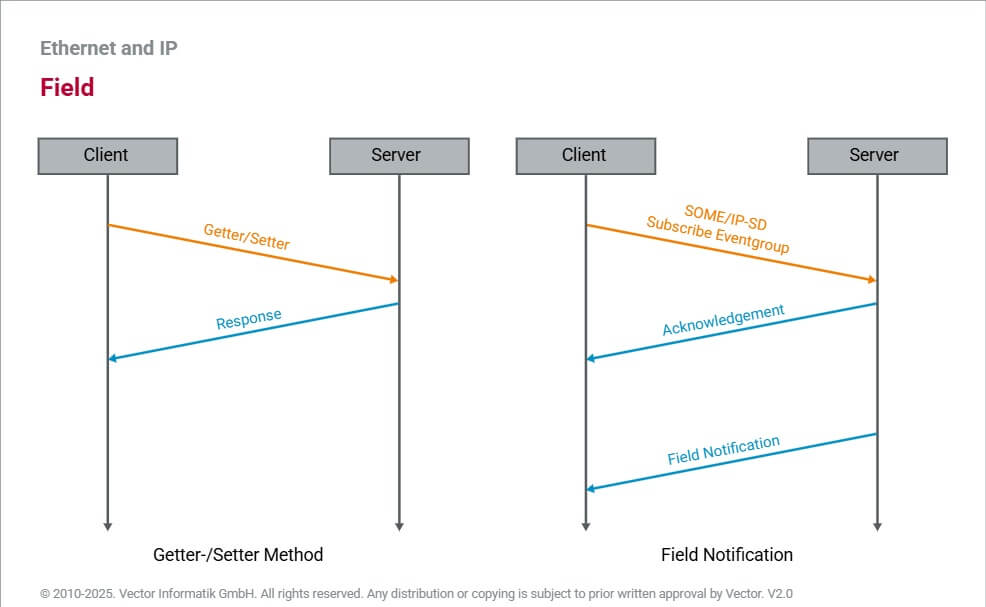 需要特别说明的是,在SOME/IP协议中,事件总是以事件组(Event group)的形式进行组织,客户端仅能订阅整个事件组,而无法单独订阅组内某个特定事件。Field的Setter/Getter 方法遵循请求/响应(REQUEST/RESPONSE)模式,变更通知则通过事件机制实现,所有订阅操作都需通过SOME/IP服务发现(SOME/IP Service Discovery)协议完成。