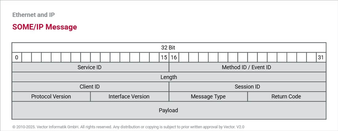 SOME/IP是基于TCP/UDP/IP协议之上的应用层协议,很像网络开发中前后端交互的HTTP的方式。如果之前做过前后端的开发,对于客户端和服务器的连接有一定的知识储备,那么在了解SOME/IP的过程中会觉得很简单的。SOME/IP依托于TCP或UDP,所有的数据都是作为TCP/UDP的Payload通过IP协议进行传输。可以理解成在Payload中又做了进一步的切分,并且比特位以及长度做了事先约定,例如下图中的前16个Bit固定为Service ID,紧接着的16个Bit为Method ID或者Event ID。