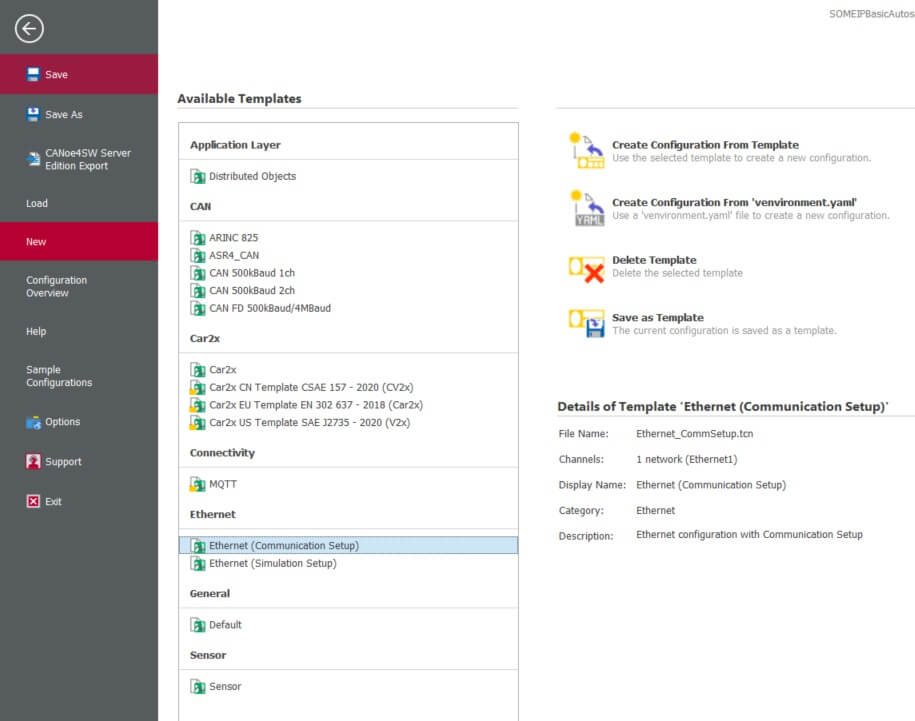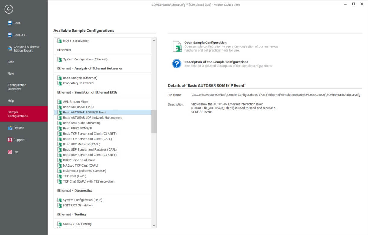 接下来记录一下用CANoe怎样调试或者模拟AUTOSAR环境下的SOME/IP通信,在这里我使用的是CANoe SP5的一个SOME/IP例程:Basic AUTOSAR SOME/IP Event,如下图。