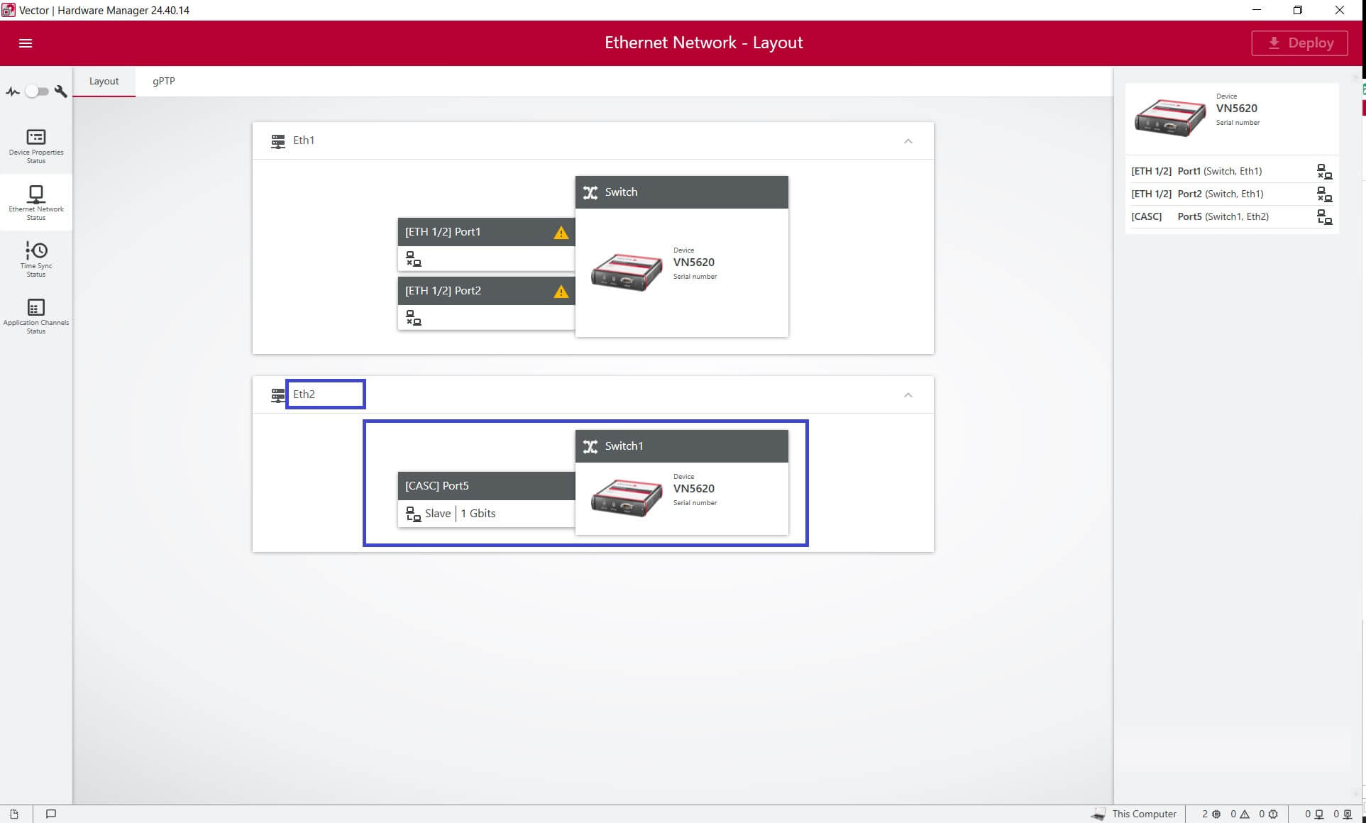 由于Vector 将于CANoe 19 取消对于本机网卡的支持,所以我也尝试了使用Vector硬件VN5620作为网络适配器来连接。在 Vector Hardware Manager中将CASC端口配置在Eth2中,然后硬件层面将VN5620盒子后端的CASC用RJ45网线与路由器相连。