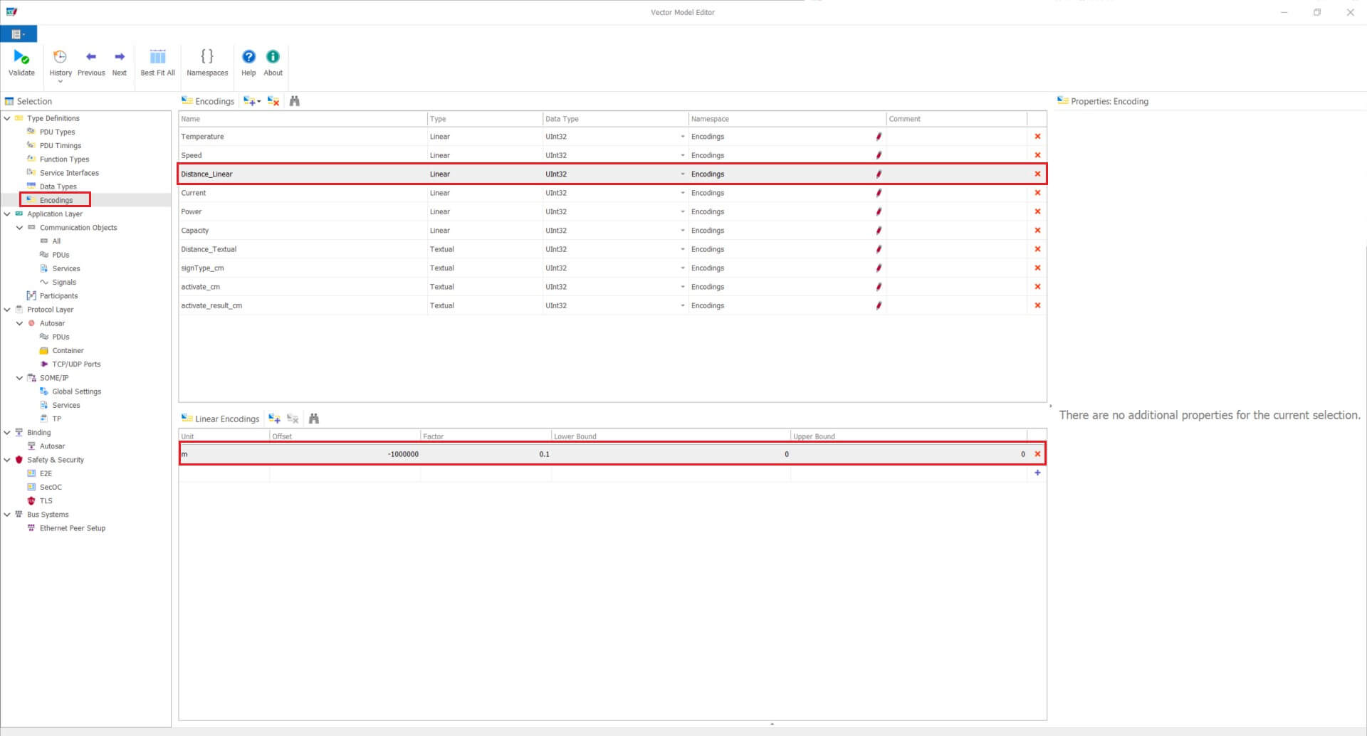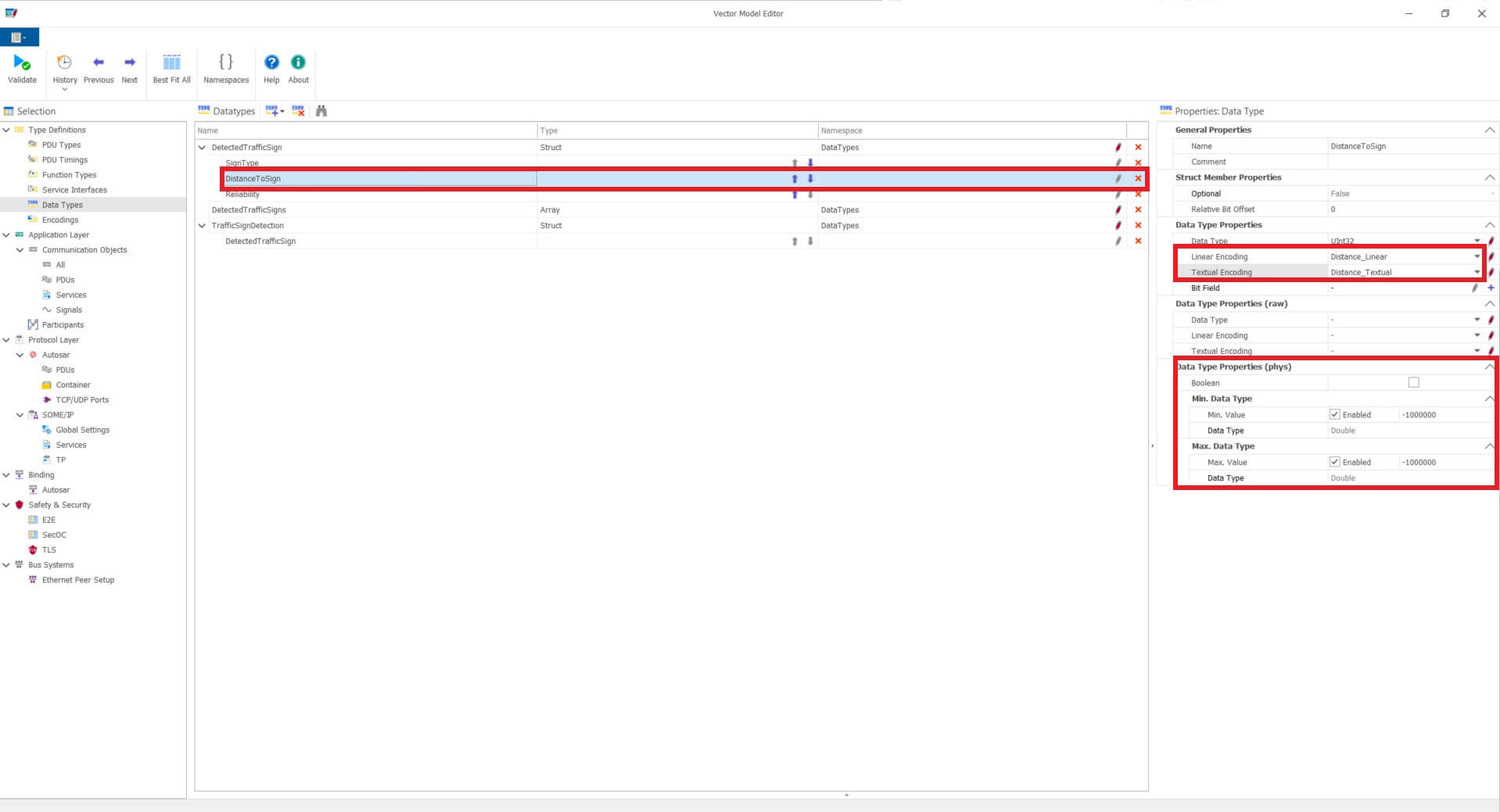 同样的道理,Distance这个值使用了SOME/IP的Uint32数据类型,又结合了AUTOSAR支持的Linear数据结构,设置了Offset和Factor分别为-1000000和0.1,单位为m,从而实现总线数值到物理值的转换。