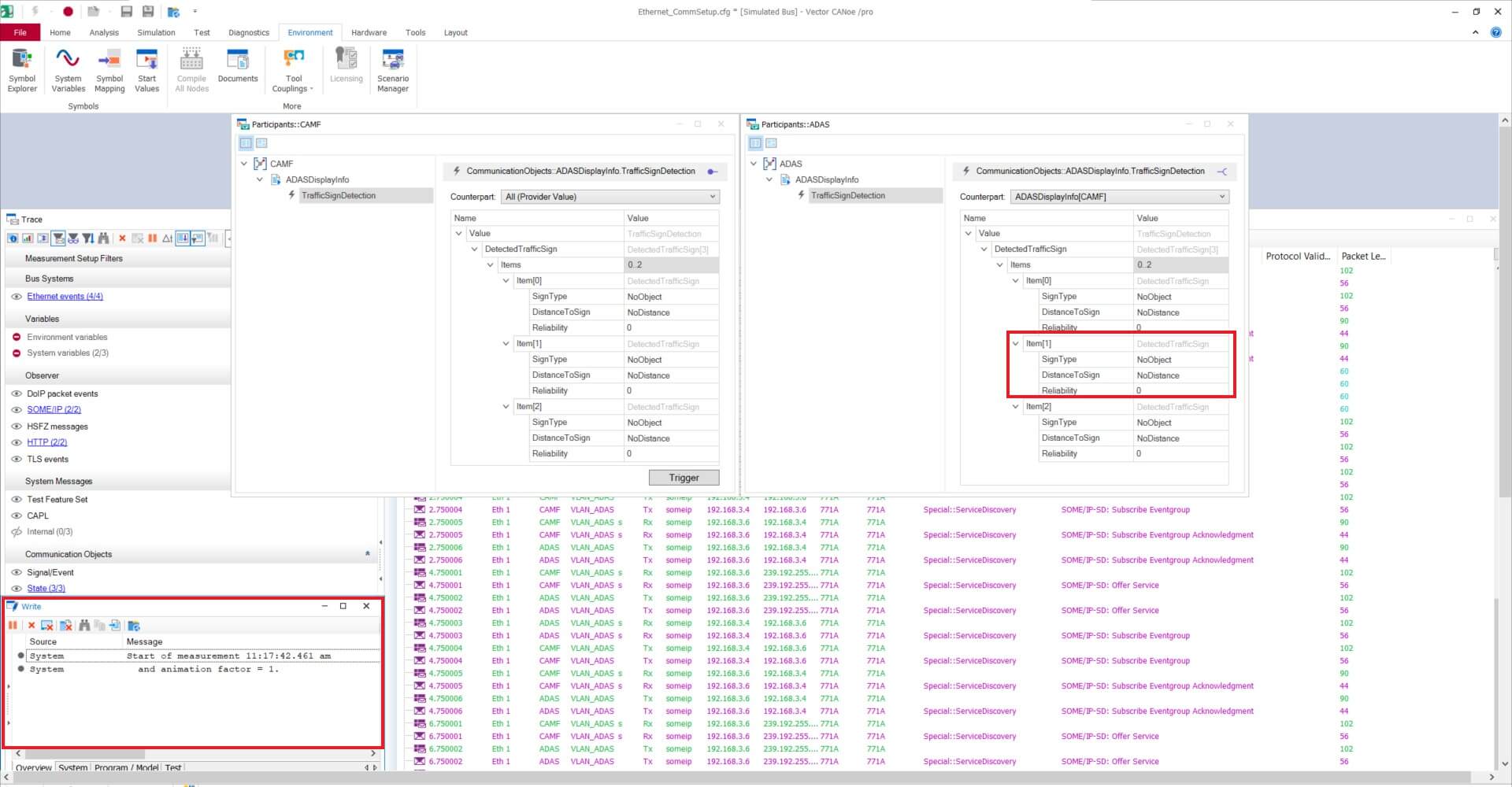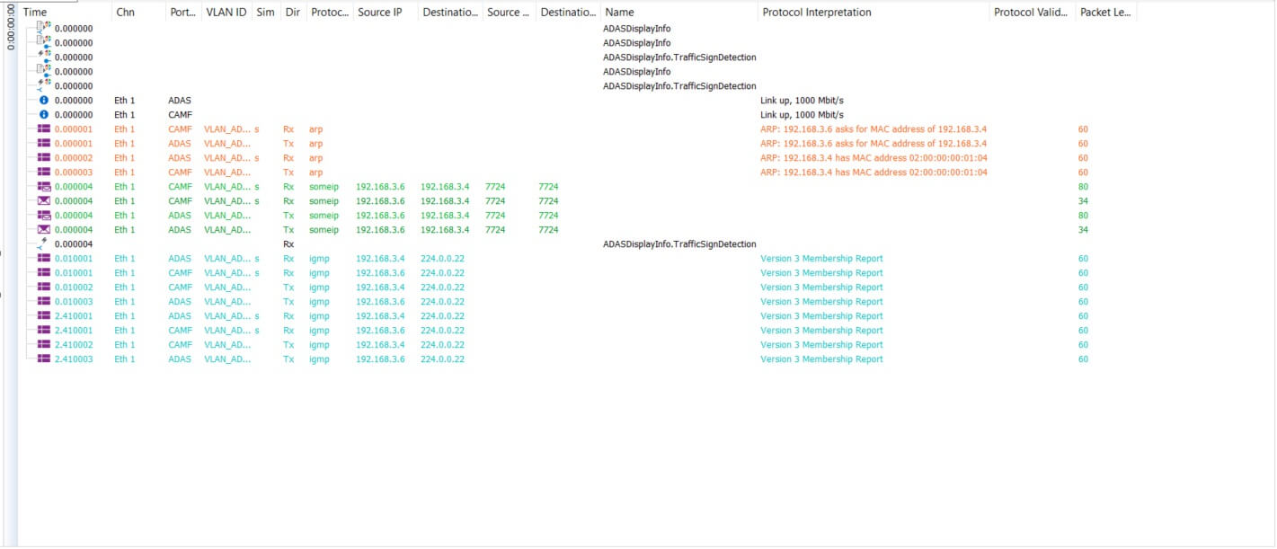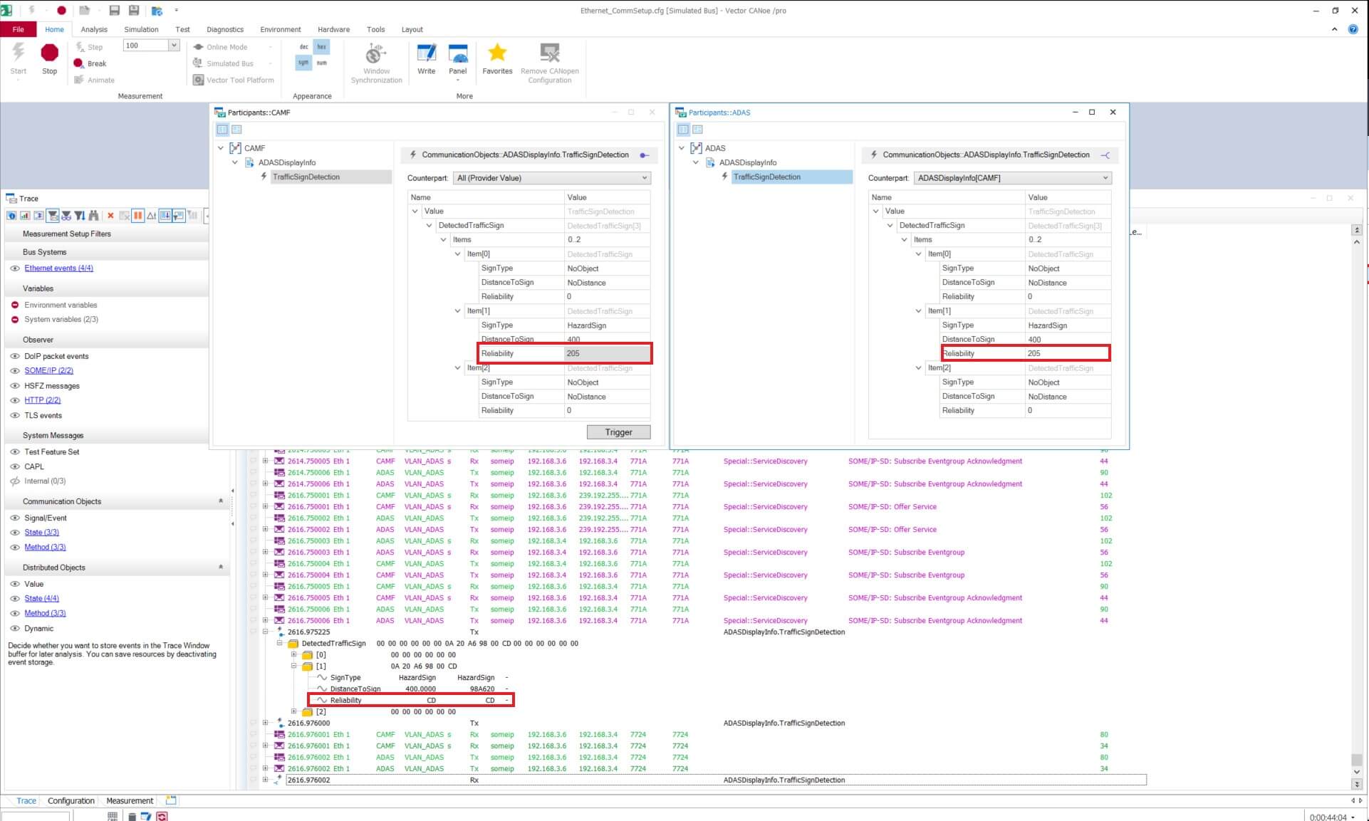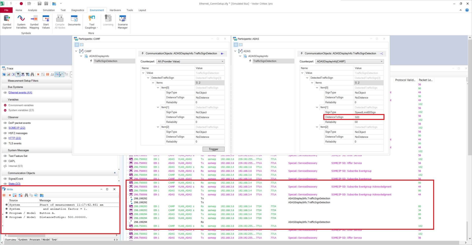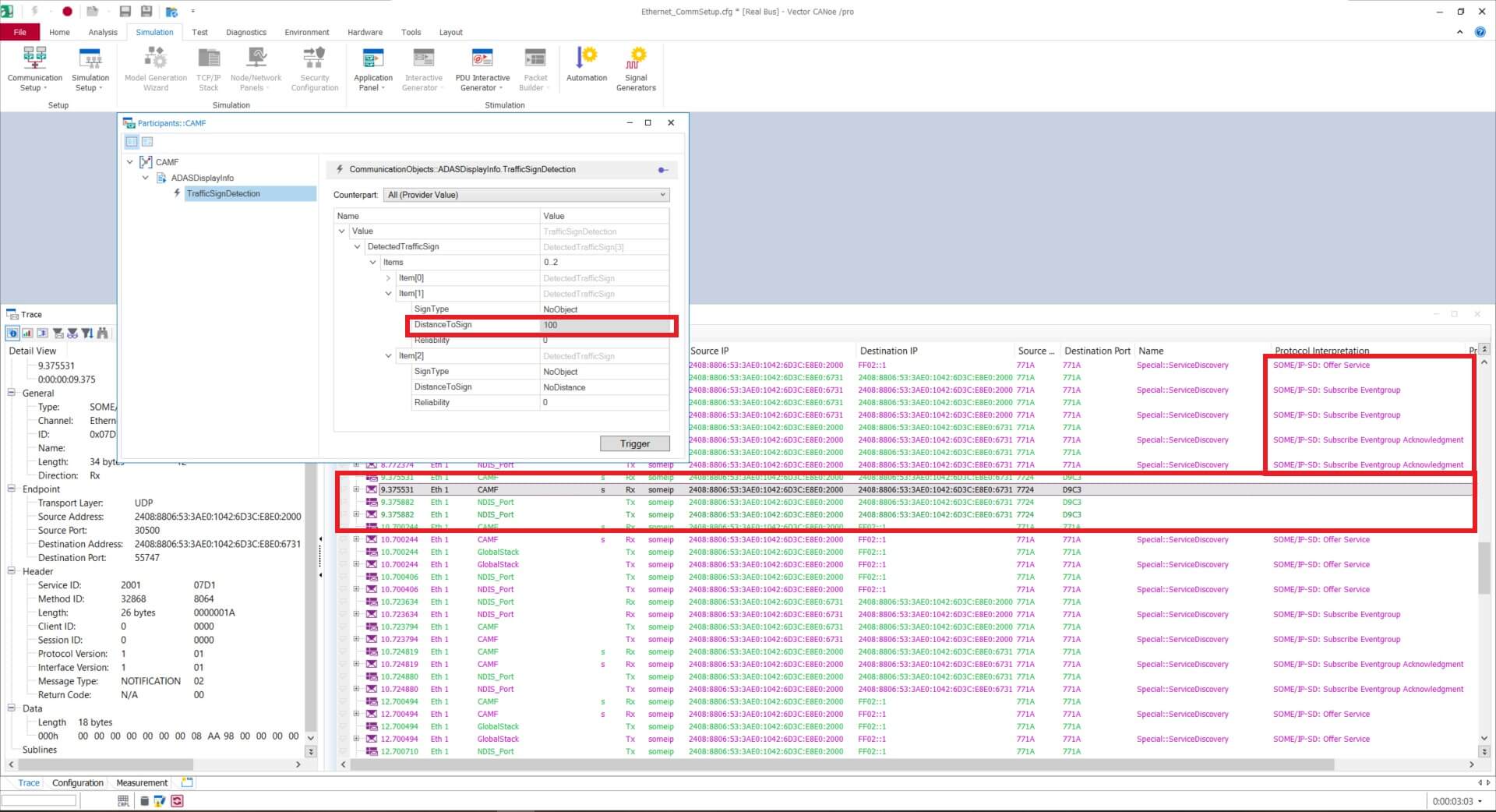 这样设置后即可以和之前一样实现CANoe仿真节点和通过以太网连接的另一台设备进行SOME/IP通信,下图是我自己尝试成功的截图。
