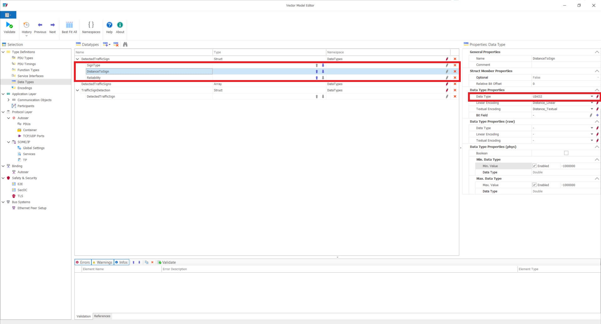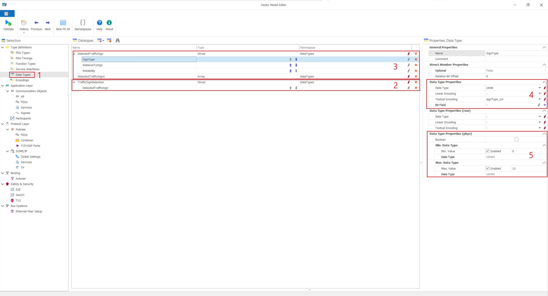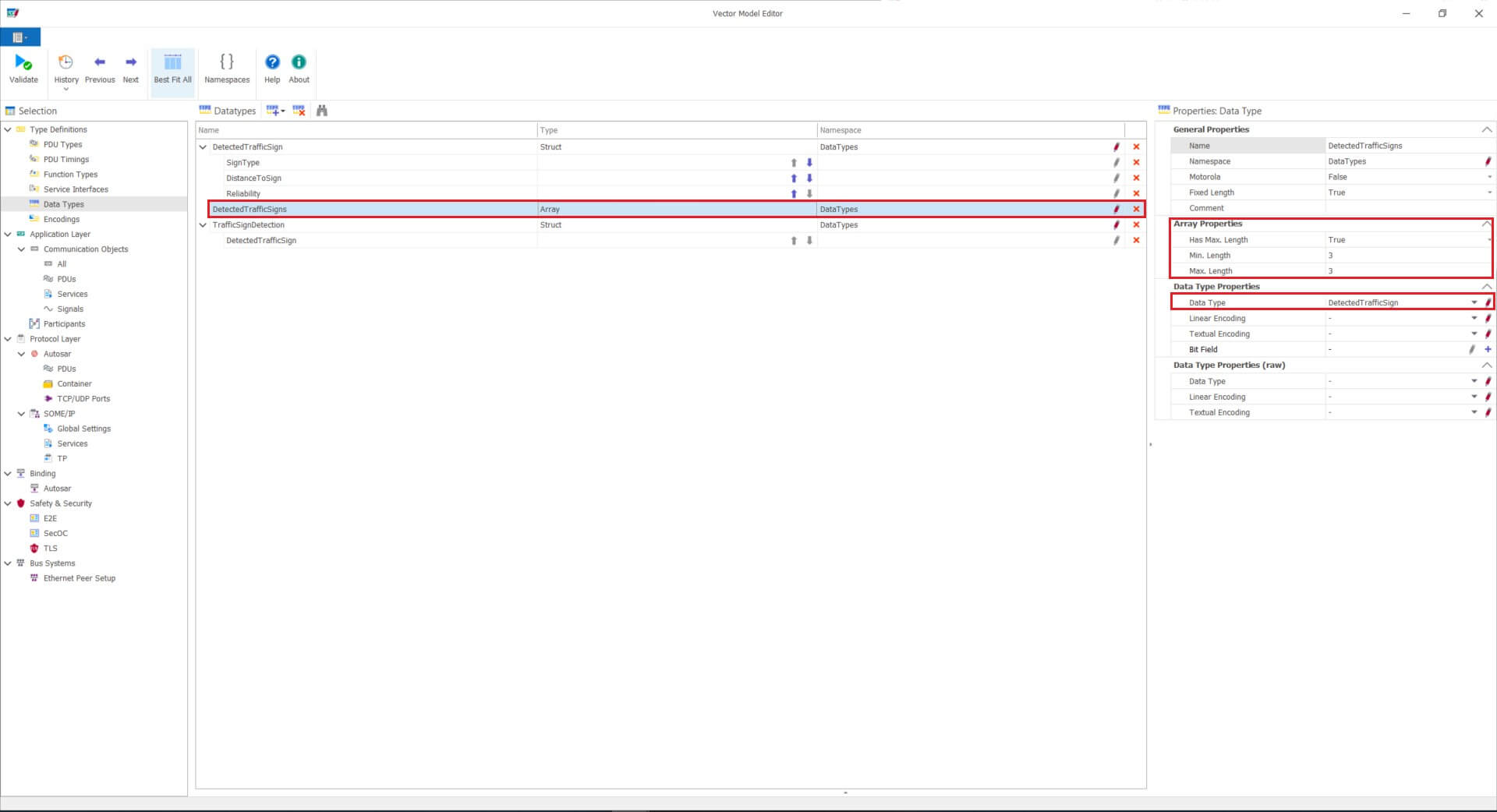 接下来切到Type Definitions下的Data Types,这里是Event真正用到的数据类型。可以看到Struct结构体形式的TrafficSignDetection嵌套了Array形式的DetectedTrafficSigns,然后再次嵌套了DetectedTrafficSign,并且一共有三个,然后每一个又嵌套了SignType、DistanceToSign以及Realiablity个Autosar定义后的数据类型。